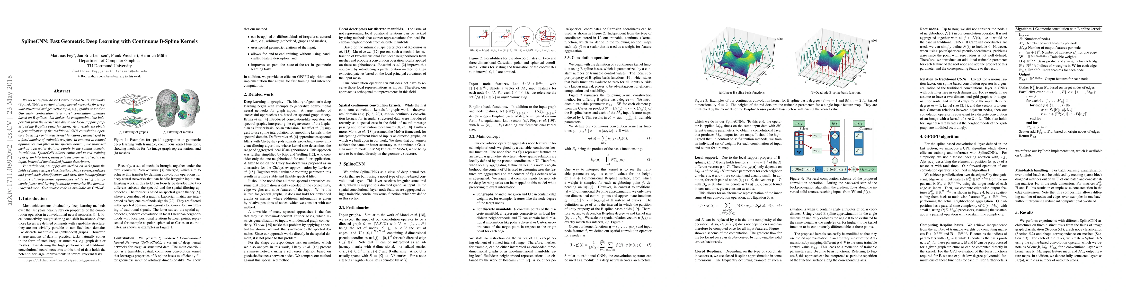 SplineCNN: A new deep learning approach that uses B-spline kernels to speed up geometric processing, outperforming state-of-the-art methods while being faster and more flexible.