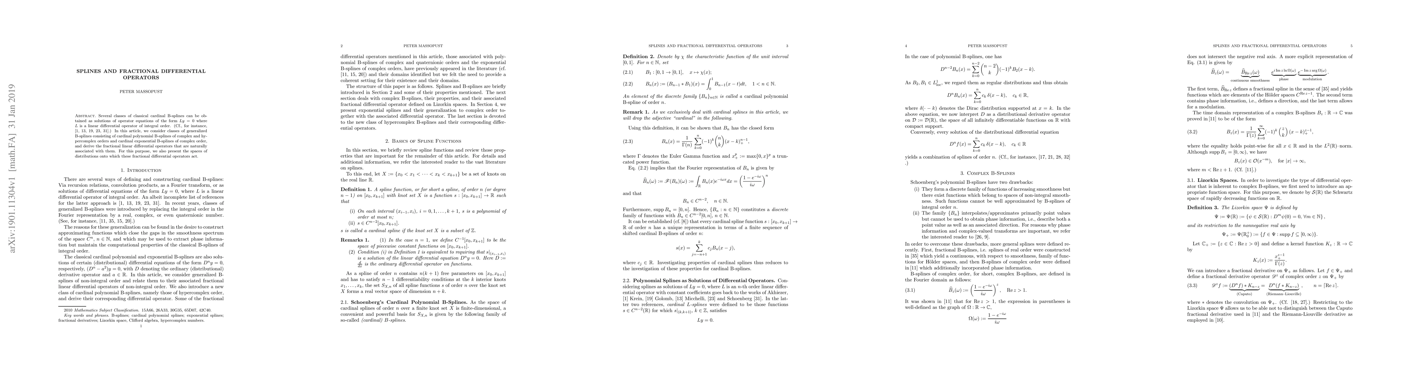 This paper explores generalized B-splines, including polynomial B-splines of complex and hypercomplex orders and exponential B-splines of complex order, and derives the corresponding fractional linear differential operators. It also defines the spaces of distributions for these operators.