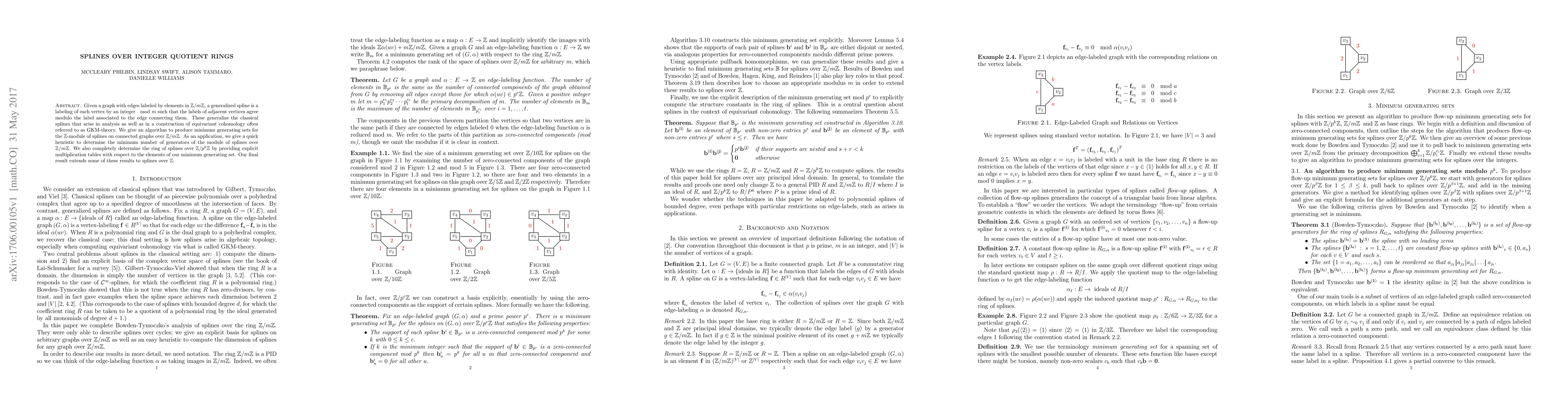 This paper presents an algorithm for generating minimum sets for the $\mathbb{Z}$-module of splines over $\mathbb{Z}/m\mathbb{Z}$ and provides a heuristic for determining the minimum number of spline generators. It also determines the ring of splines over $\mathbb{Z}/p^k\mathbb{Z}$ with explicit multiplication tables and extends some results to splines over $\mathbb{Z}$.