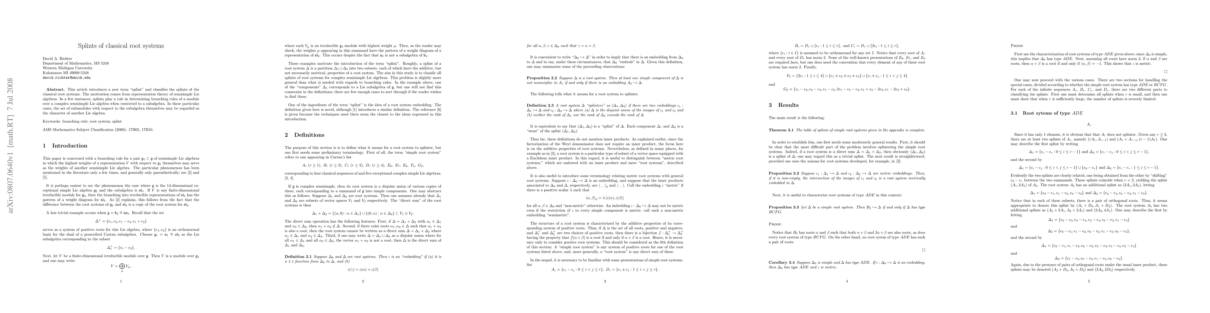 This paper introduces "splints" to classify structures within classical root systems, motivated by representation theory of semisimple Lie algebras. It explores how splints can determine branching rules and the character of submodules in specific cases.