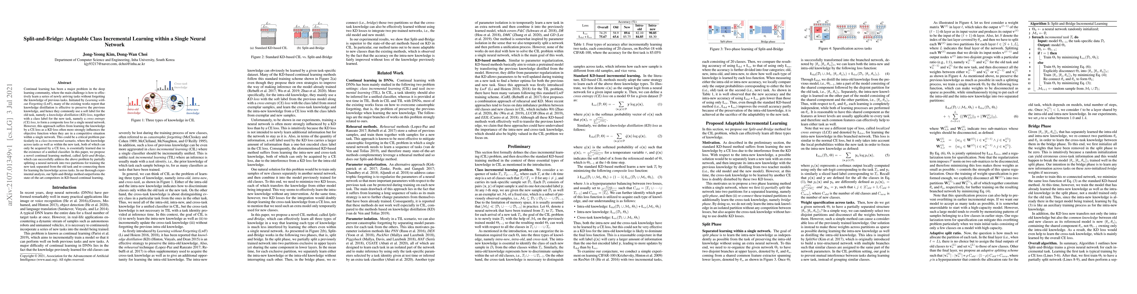 Continual learning has been a major problem in the deep learning community, where the main challenge is how to effectively learn a series of newly arriving tasks without forgetting the knowledge of previous tasks. Initiated by Learning without Forgetting (LwF), many of the existing works report that knowledge distillation is effective to preserve the previous knowledge, and hence they commonly use a soft label for the old task, namely a knowledge distillation (KD) loss, together with a class label for the new task, namely a cross entropy (CE) loss, to form a composite loss for a single neural network. However, this approach suffers from learning the knowledge by a CE loss as a KD loss often more strongly influences the objective function when they are in a competitive situation within a single network. This could be a critical problem particularly in a class incremental scenario, where the knowledge across tasks as well as within the new task, both of which can only be acquired by a CE loss, is essentially learned due to the existence of a unified classifier. In this paper, we propose a novel continual learning method, called Split-and-Bridge, which can successfully address the above problem by partially splitting a neural network into two partitions for training the new task separated from the old task and re-connecting them for learning the knowledge across tasks. In our thorough experimental analysis, our Split-and-Bridge method outperforms the state-of-the-art competitors in KD-based continual learning.