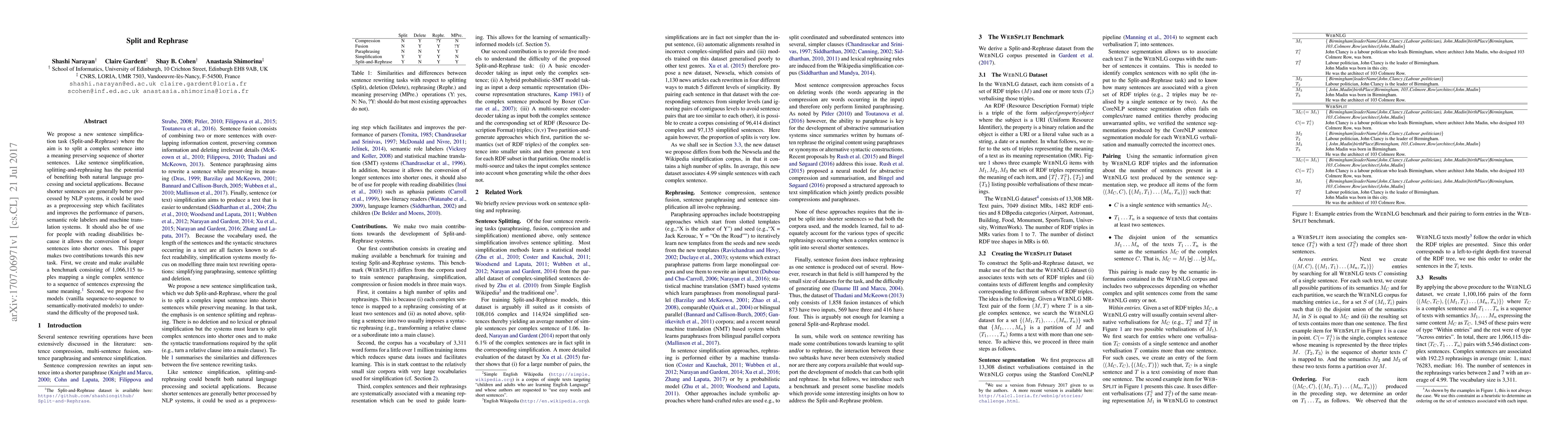 We propose a new sentence simplification task (Split-and-Rephrase) where the aim is to split a complex sentence into a meaning preserving sequence of shorter sentences. Like sentence simplification, splitting-and-rephrasing has the potential of benefiting both natural language processing and societal applications. Because shorter sentences are generally better processed by NLP systems, it could be used as a preprocessing step which facilitates and improves the performance of parsers, semantic role labellers and machine translation systems. It should also be of use for people with reading disabilities because it allows the conversion of longer sentences into shorter ones. This paper makes two contributions towards this new task. First, we create and make available a benchmark consisting of 1,066,115 tuples mapping a single complex sentence to a sequence of sentences expressing the same meaning. Second, we propose five models (vanilla sequence-to-sequence to semantically-motivated models) to understand the difficulty of the proposed task.