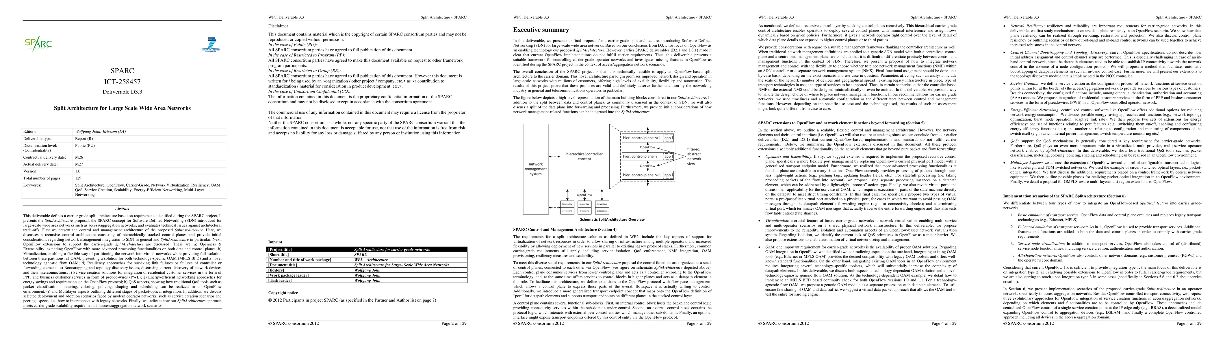 This paper proposes a carrier-grade split architecture for large-scale wide area networks, focusing on hierarchical control planes and OpenFlow extensions to support scalability, resiliency, and service creation. It evaluates technical aspects and deployment scenarios for modern operator networks.