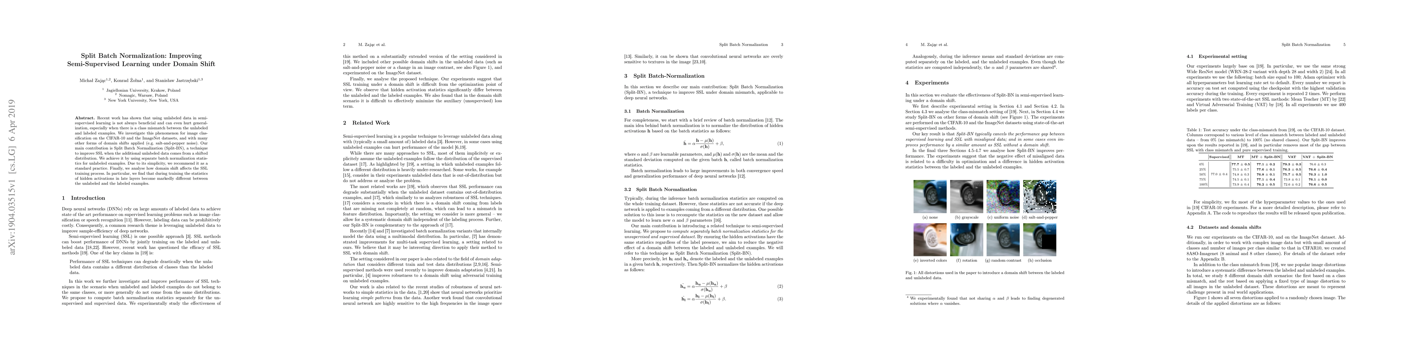 Recent work has shown that using unlabeled data in semi-supervised learning is not always beneficial and can even hurt generalization, especially when there is a class mismatch between the unlabeled and labeled examples. We investigate this phenomenon for image classification on the CIFAR-10 and the ImageNet datasets, and with many other forms of domain shifts applied (e.g. salt-and-pepper noise). Our main contribution is Split Batch Normalization (Split-BN), a technique to improve SSL when the additional unlabeled data comes from a shifted distribution. We achieve it by using separate batch normalization statistics for unlabeled examples. Due to its simplicity, we recommend it as a standard practice. Finally, we analyse how domain shift affects the SSL training process. In particular, we find that during training the statistics of hidden activations in late layers become markedly different between the unlabeled and the labeled examples.