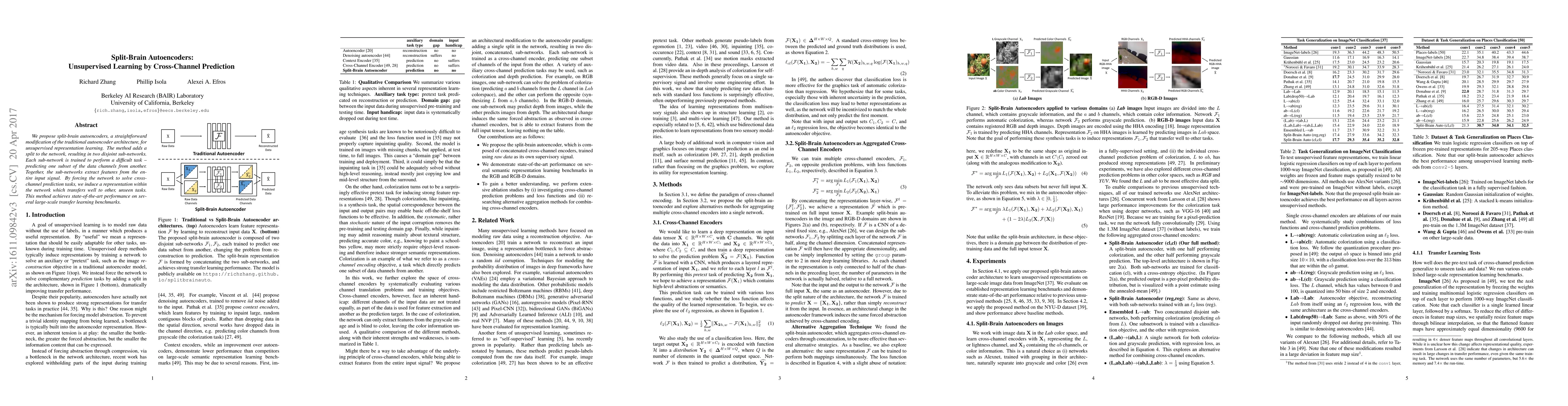 We propose split-brain autoencoders, a straightforward modification of the traditional autoencoder architecture, for unsupervised representation learning. The method adds a split to the network, resulting in two disjoint sub-networks. Each sub-network is trained to perform a difficult task -- predicting one subset of the data channels from another. Together, the sub-networks extract features from the entire input signal. By forcing the network to solve cross-channel prediction tasks, we induce a representation within the network which transfers well to other, unseen tasks. This method achieves state-of-the-art performance on several large-scale transfer learning benchmarks.