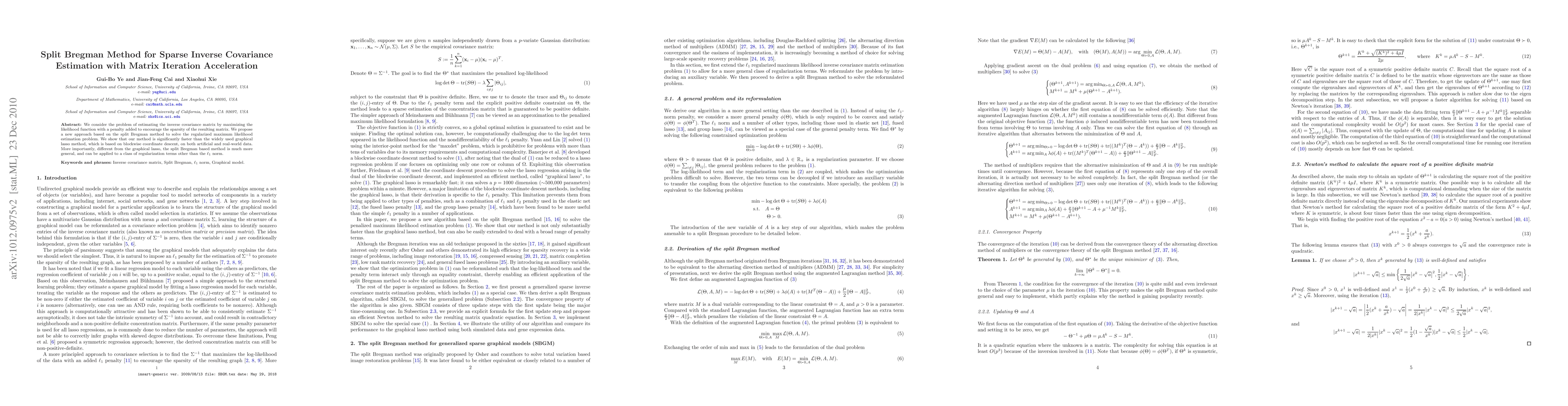 We consider the problem of estimating the inverse covariance matrix by maximizing the likelihood function with a penalty added to encourage the sparsity of the resulting matrix. We propose a new approach based on the split Bregman method to solve the regularized maximum likelihood estimation problem. We show that our method is significantly faster than the widely used graphical lasso method, which is based on blockwise coordinate descent, on both artificial and real-world data. More importantly, different from the graphical lasso, the split Bregman based method is much more general, and can be applied to a class of regularization terms other than the $\ell_1$ norm