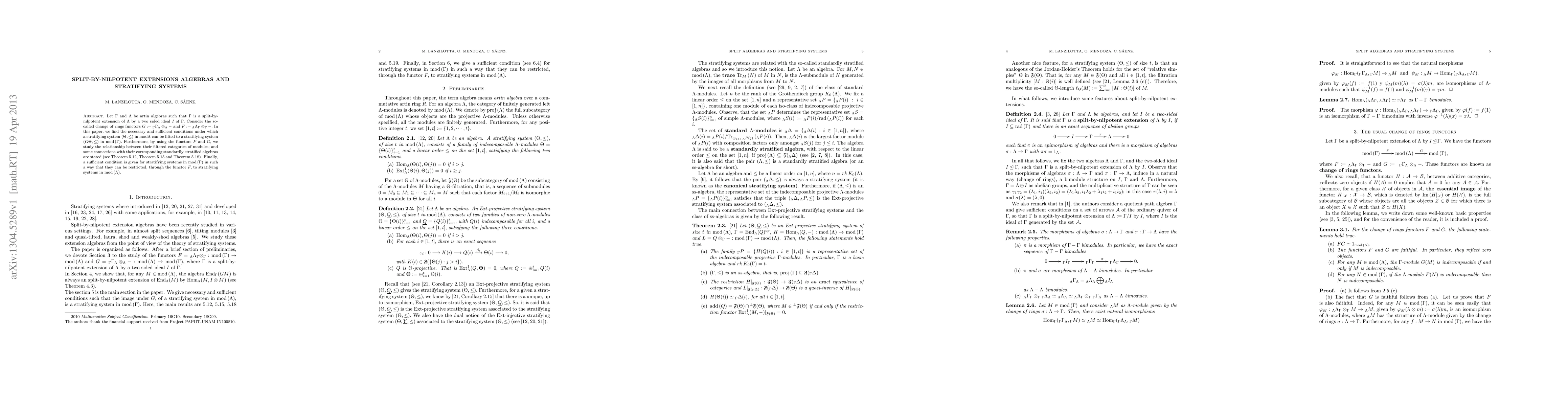Let $\Gamma$ and $\Lambda$ be artin algebras such that $\Gamma$ is a split-by-nilpotent extension of $\Lambda$ by a two sided ideal $I$ of $\Gamma.$ Consider the so-called change of rings functors $G:={}_\Gamma\Gamma_\Lambda\otimes_\Lambda -$ and $F:={}_\Lambda \Lambda_\Gamma\otimes_\Gamma -.$ In this paper, we find the necessary and sufficient conditions under which a stratifying system $(\Theta,\leq)$ in $\modu\Lambda$ can be lifted to a stratifying system $(G\Theta,\leq)$ in $\modu\,(\Gamma).$ Furthermore, by using the functors $F$ and $G,$ we study the relationship between their filtered categories of modules and some connections with their corresponding standardly stratified algebras are stated. Finally, a sufficient condition is given for stratifying systems in $\modu\,(\Gamma)$ in such a way that they can be restricted, through the functor $F,$ to stratifying systems in $\modu\,(\Lambda).$