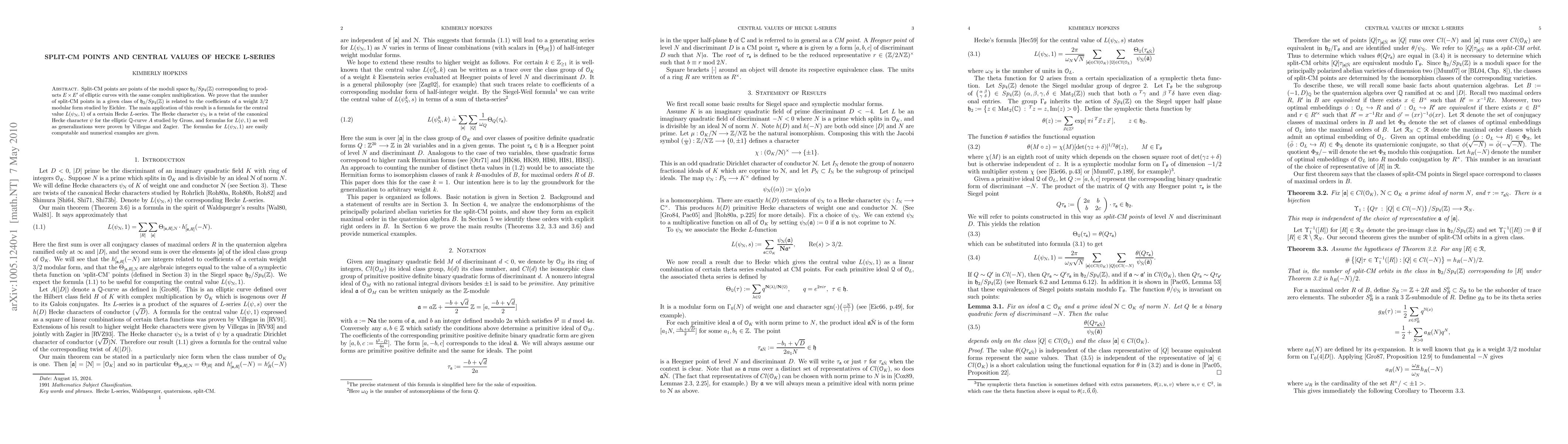 This paper establishes a connection between split-CM points in the moduli space h_2/Sp_4(Z) and the coefficients of a specific weight 3/2 modular form. It then applies this relationship to derive a formula for the central value $L(\psi_N, 1)$ of a Hecke L-series, which generalizes previous results for $L(\psi, 1)$.