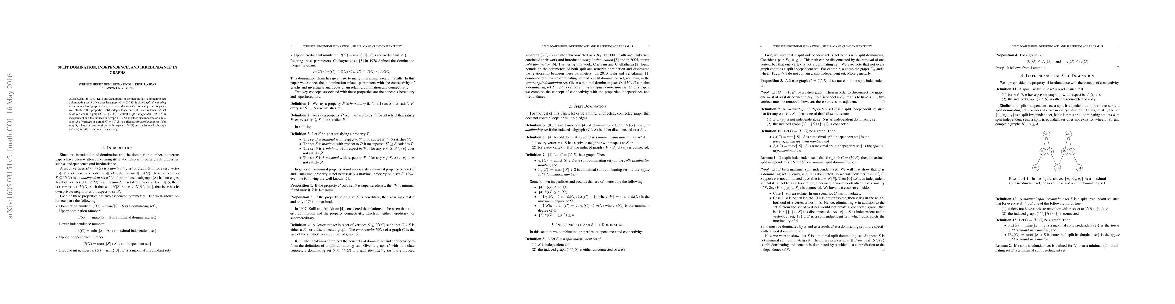 In 1978, Kulli and Janakiram \citep{KulliJanakiramSplit} defined the split dominating set: a dominating set $S$ of vertices in a graph $G = (V, E)$ is called {\em split dominating} if the induced subgraph $\langle V \setminus S\rangle$ is either disconnected or a $K_1$. In this paper we introduce the properties split independence and split irredundance. A set $S$ of vertices in a graph $G =(V,E)$ is called a {\em split independent set} if $S$ is independent and the induced subgraph $\langle V \setminus S \rangle$ is either disconnected or a $K_1$. A set $S$ of vertices in a graph $G = (V,E)$ is called a {\em split irredundant set} if for $u \in S$, $u$ has a private neighbor with respect to $V(S)$ and the induced subgraph $\langle V \setminus S\rangle$ is either disconnected or a $K_1$.