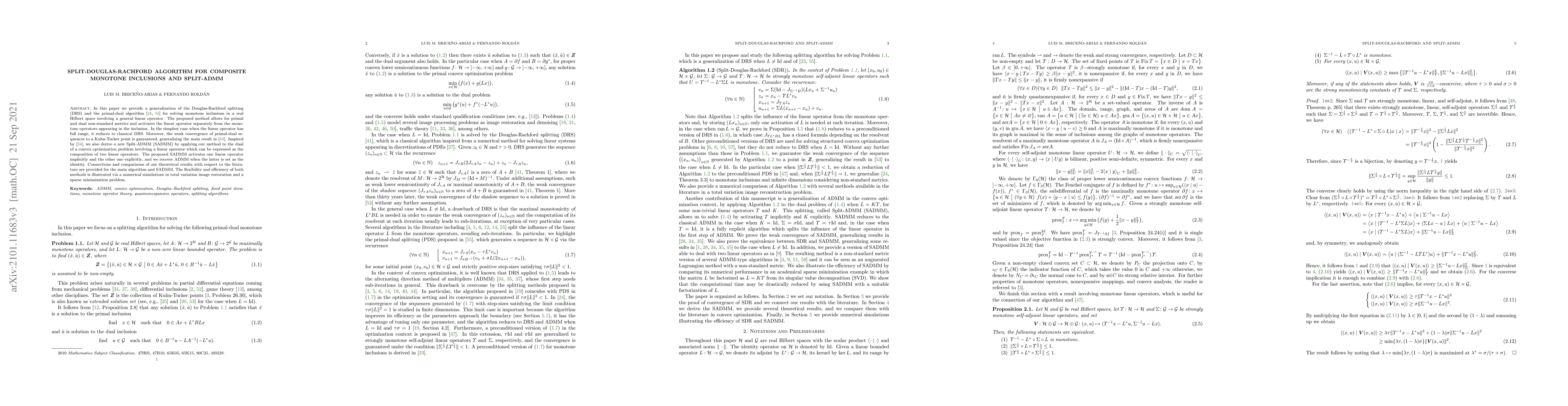 This paper generalizes the Douglas-Rachford splitting and primal-dual algorithm for solving monotone inclusions, introducing a new Split-ADMM method. It guarantees weak convergence to a Kuhn-Tucker point and demonstrates flexibility through numerical simulations in image restoration and sparse minimization.