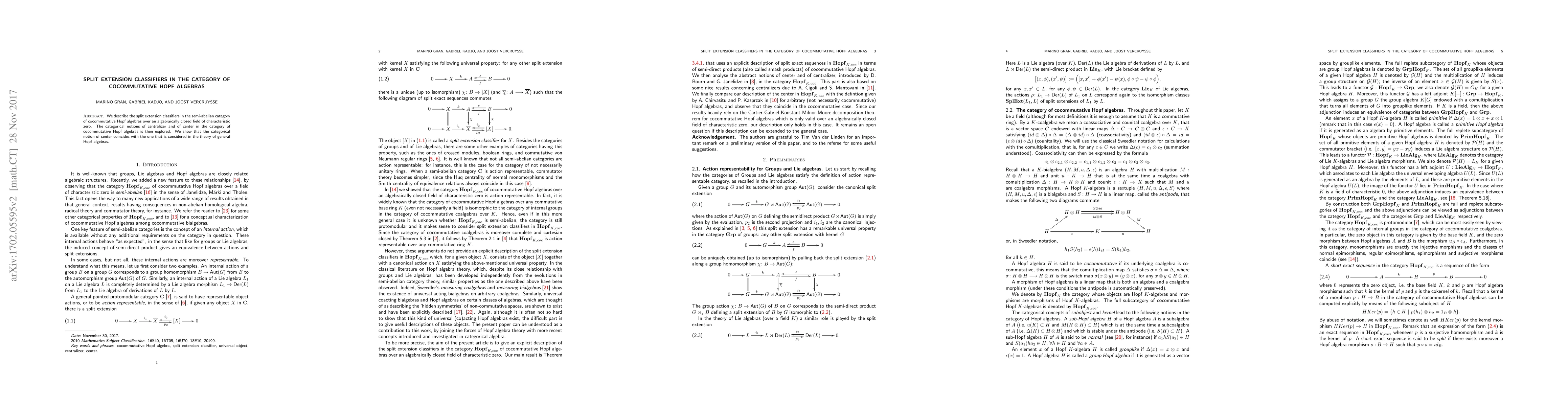 We describe the split extension classifiers in the semi-abelian category of cocommutative Hopf algebras over an algebraically closed field of characteristic zero. The categorical notions of centralizer and of center in the category of cocommutative Hopf algebras is then explored. We show that the categorical notion of center coincides with the one that is considered in the theory of general Hopf algebras.