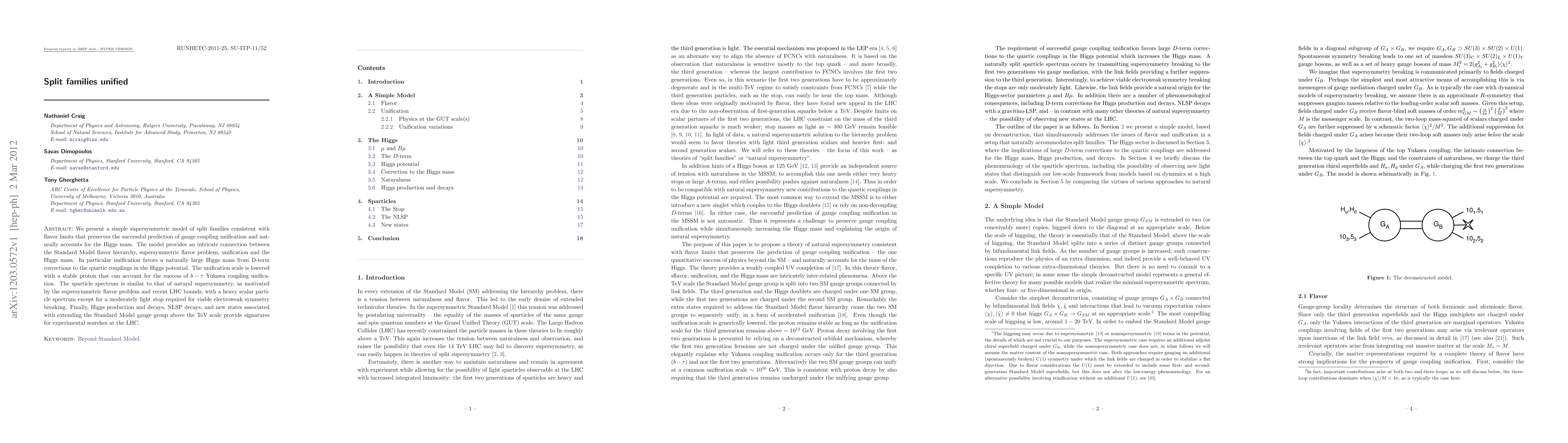 We present a simple supersymmetric model of split families consistent with flavor limits that preserves the successful prediction of gauge coupling unification and naturally accounts for the Higgs mass. The model provides an intricate connection between the Standard Model flavor hierarchy, supersymmetric flavor problem, unification and the Higgs mass. In particular unification favors a naturally large Higgs mass from D-term corrections to the quartic couplings in the Higgs potential. The unification scale is lowered with a stable proton that can account for the success of b-tau Yukawa coupling unification. The sparticle spectrum is similar to that of natural supersymmetry, as motivated by the supersymmetric flavor problem and recent LHC bounds, with a heavy scalar particle spectrum except for a moderately light stop required for viable electroweak symmetry breaking. Finally, Higgs production and decays, NLSP decays, and new states associated with extending the Standard Model gauge group above the TeV scale provide signatures for experimental searches at the LHC.