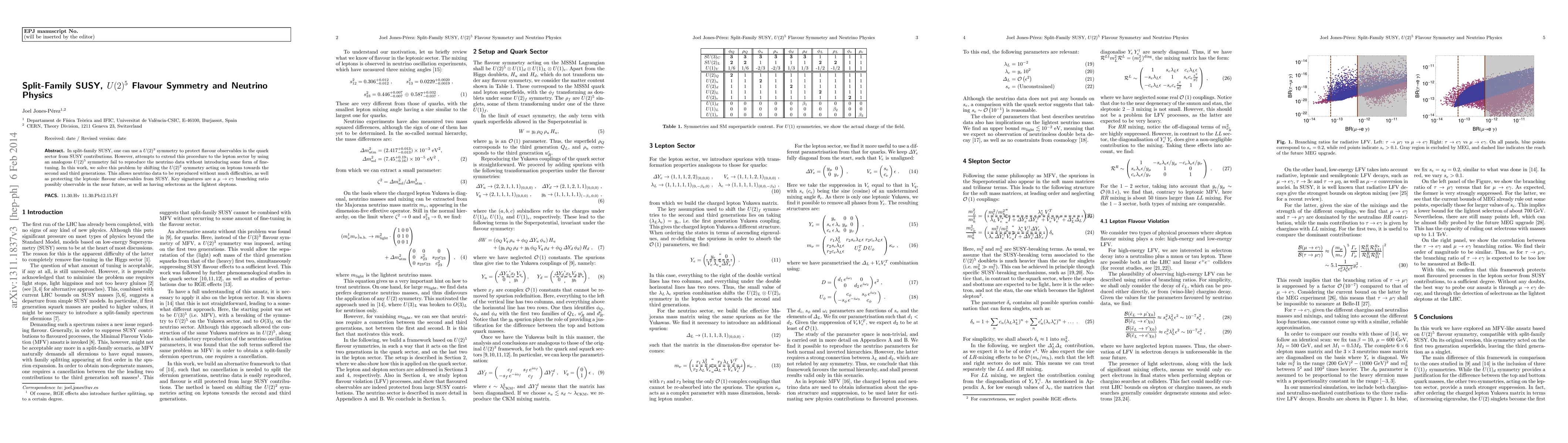 This paper proposes a modified split-family SUSY model using a U(2)^5 flavour symmetry to accurately reproduce neutrino data without significant fine-tuning, while protecting leptonic flavour observables from SUSY contributions. Key predictions include a potentially observable $\mu\to e\gamma$ branching ratio and selectrons as the lightest sleptons.