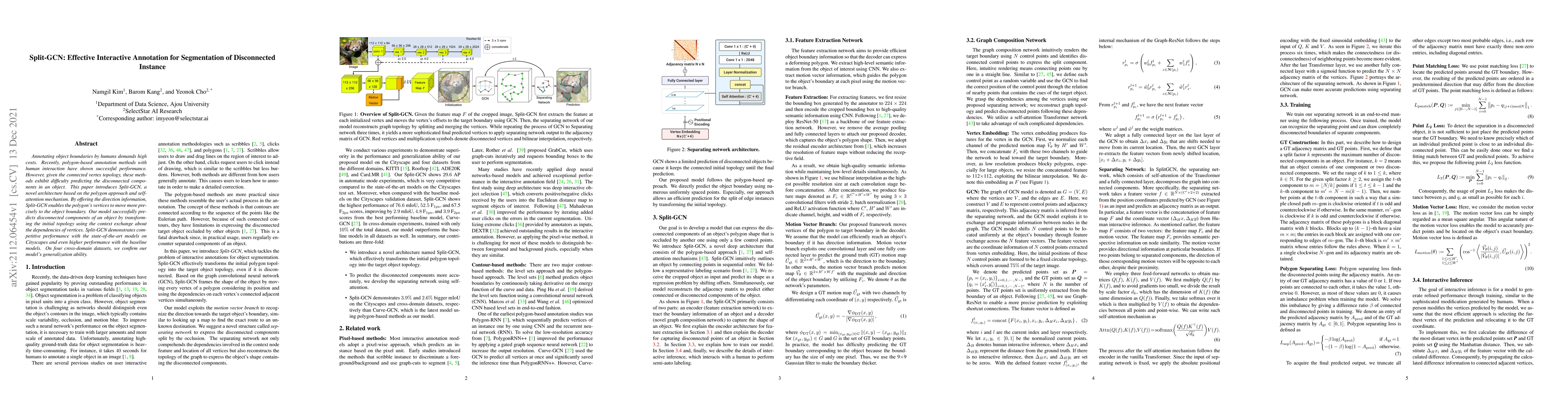 Annotating object boundaries by humans demands high costs. Recently, polygon-based annotation methods with human interaction have shown successful performance. However, given the connected vertex topology, these methods exhibit difficulty predicting the disconnected components in an object. This paper introduces Split-GCN, a novel architecture based on the polygon approach and self-attention mechanism. By offering the direction information, Split-GCN enables the polygon vertices to move more precisely to the object boundary. Our model successfully predicts disconnected components of an object by transforming the initial topology using the context exchange about the dependencies of vertices. Split-GCN demonstrates competitive performance with the state-of-the-art models on Cityscapes and even higher performance with the baseline models. On four cross-domain datasets, we confirm our model's generalization ability.
