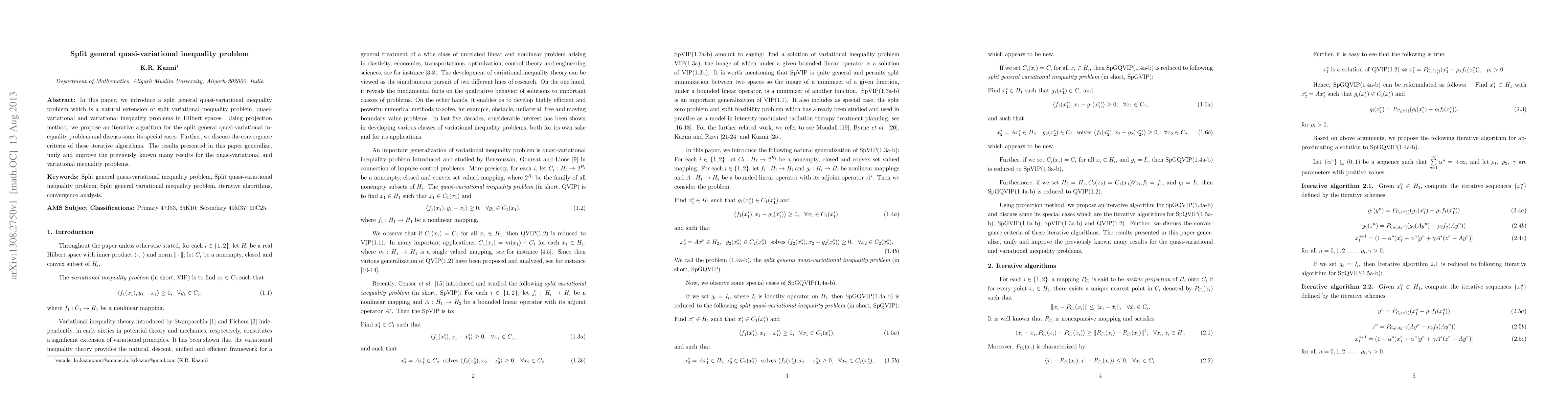 This paper introduces a split general quasi-variational inequality problem, extending existing variational and quasi-variational inequalities in Hilbert spaces. An iterative algorithm using projection methods is proposed, and convergence criteria are discussed for its special cases, generalizing and improving previous results.