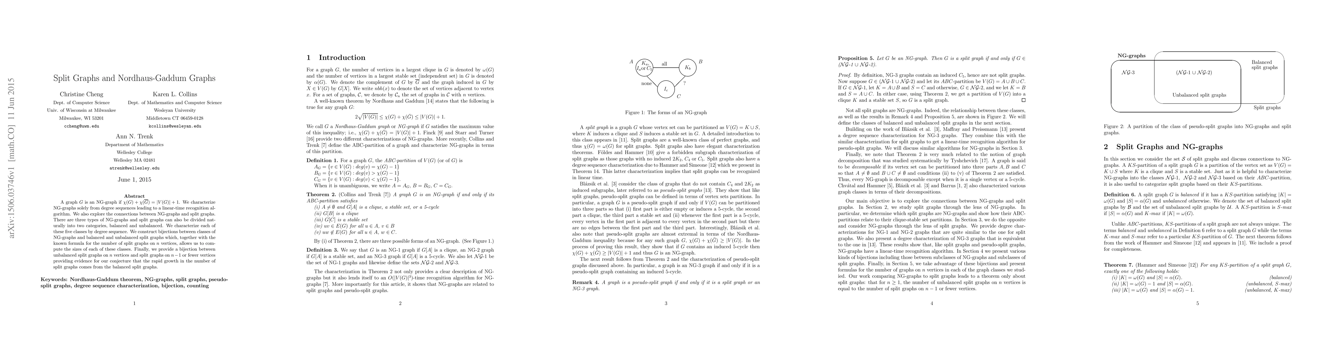 A graph G is an NG-graph if \chi(G) + \chi(G complement) = |V(G)| + 1. We characterize NG-graphs solely from degree sequences leading to a linear-time recognition algorithm. We also explore the connections between NG-graphs and split graphs. There are three types of NG-graphs and split graphs can also be divided naturally into two categories, balanced and unbalanced. We characterize each of these five classes by degree sequence. We construct bijections between classes of NG-graphs and balanced and unbalanced split graphs which, together with the known formula for the number of split graphs on n vertices, allows us to compute the sizes of each of these classes. Finally, we provide a bijection between unbalanced split graphs on n vertices and split graphs on n-1 or fewer vertices providing evidence for our conjecture that the rapid growth in the number of split graphs comes from the balanced split graphs.