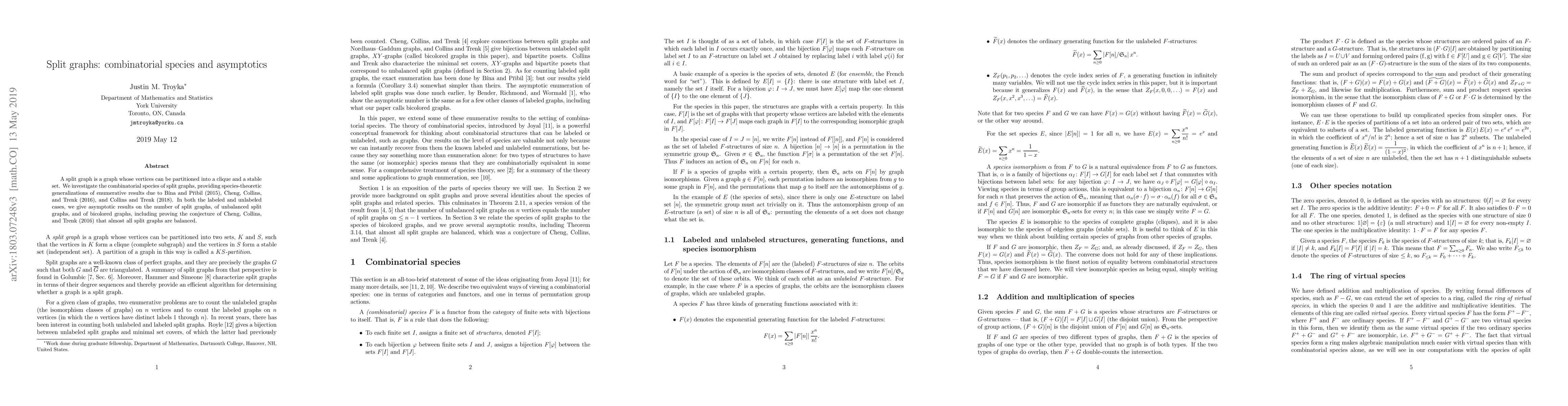 This paper explores the combinatorial species of split graphs, offering species-theoretic generalizations of previous enumerative results. It provides asymptotic results on the number of split graphs, unbalanced split graphs, and bicolored graphs, confirming the conjecture that nearly all split graphs are balanced.