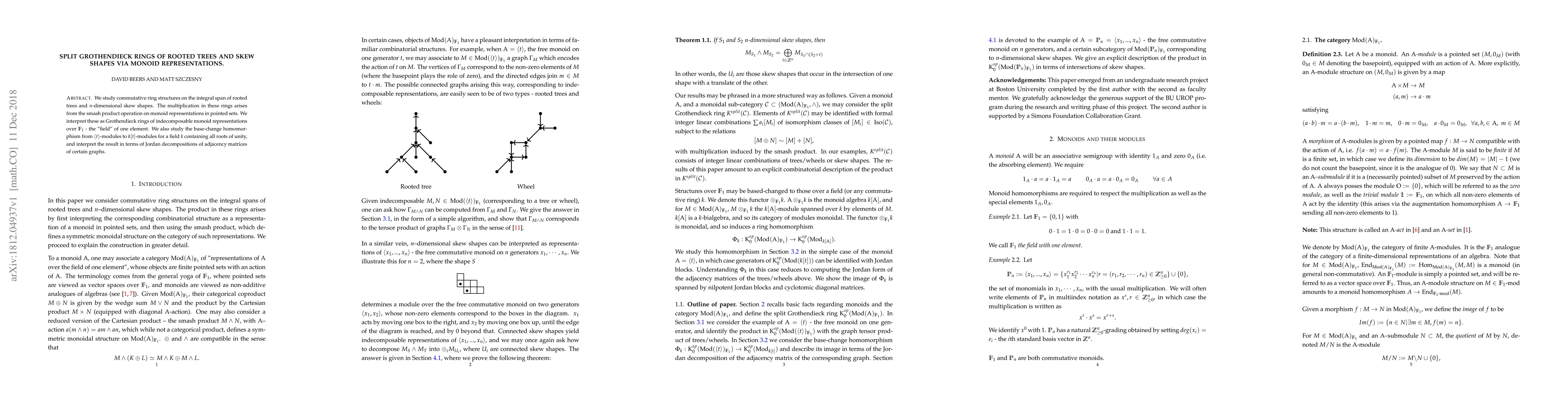 Researchers develop a new approach to studying commutative rings on rooted trees and skew shapes using monoid representations, with implications for understanding graph structure.