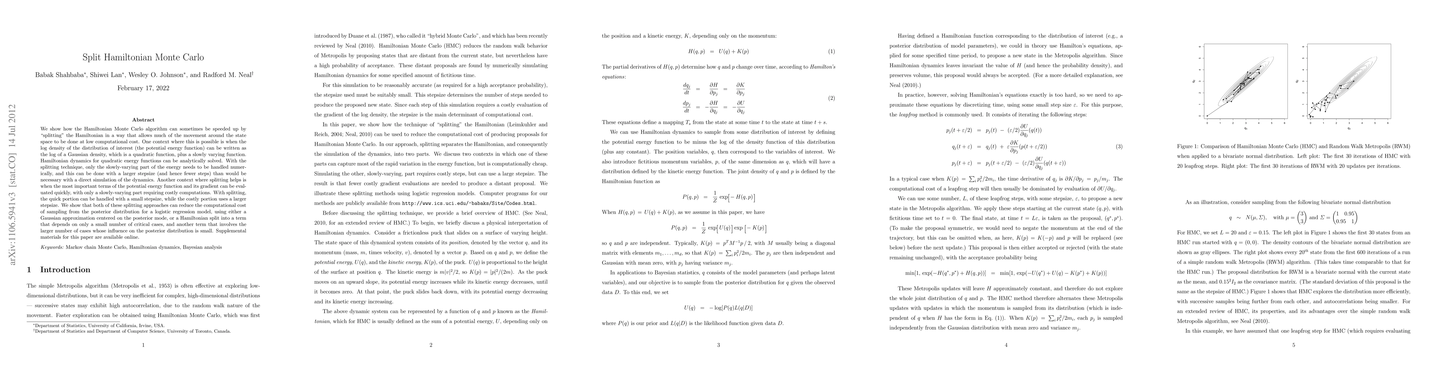 We show how the Hamiltonian Monte Carlo algorithm can sometimes be speeded up by "splitting" the Hamiltonian in a way that allows much of the movement around the state space to be done at low computational cost. One context where this is possible is when the log density of the distribution of interest (the potential energy function) can be written as the log of a Gaussian density, which is a quadratic function, plus a slowly varying function. Hamiltonian dynamics for quadratic energy functions can be analytically solved. With the splitting technique, only the slowly-varying part of the energy needs to be handled numerically, and this can be done with a larger stepsize (and hence fewer steps) than would be necessary with a direct simulation of the dynamics. Another context where splitting helps is when the most important terms of the potential energy function and its gradient can be evaluated quickly, with only a slowly-varying part requiring costly computations. With splitting, the quick portion can be handled with a small stepsize, while the costly portion uses a larger stepsize. We show that both of these splitting approaches can reduce the computational cost of sampling from the posterior distribution for a logistic regression model, using either a Gaussian approximation centered on the posterior mode, or a Hamiltonian split into a term that depends on only a small number of critical cases, and another term that involves the larger number of cases whose influence on the posterior distribution is small. Supplemental materials for this paper are available online.