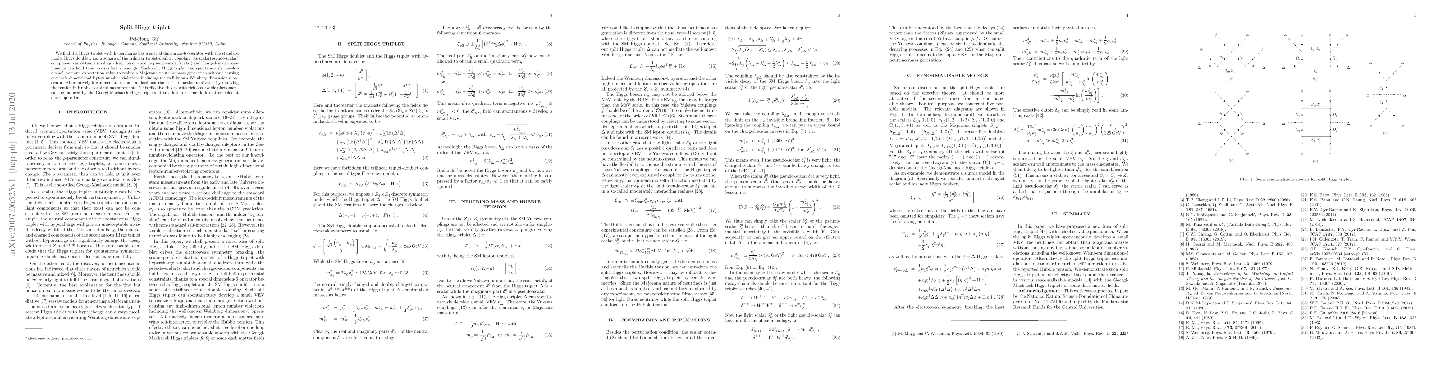 The paper proposes a 'split Higgs triplet' model where a Higgs triplet with hypercharge interacts with the standard model Higgs doublet via a unique dimension-6 operator. This setup allows for a small vacuum expectation value, facilitating Majorana neutrino mass generation without violating lepton number. Alternatively, it can explain discrepancies in Hubble constant measurements through non-standard neutrino self-interaction. The model can be derived from Georgi-Machacek Higgs triplets or dark matter fields.