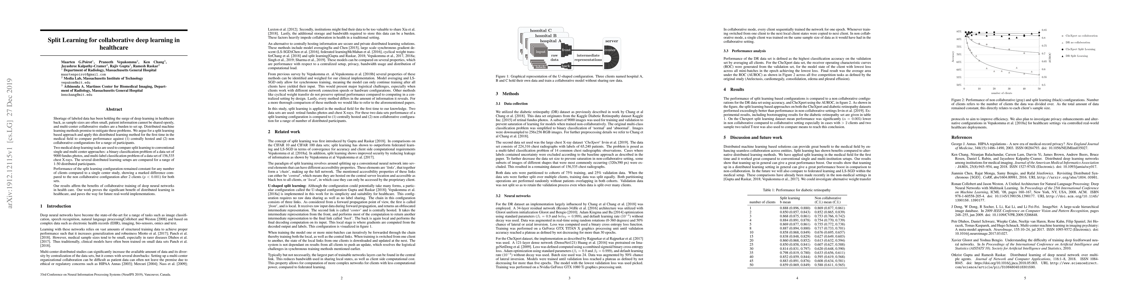 Shortage of labeled data has been holding the surge of deep learning in healthcare back, as sample sizes are often small, patient information cannot be shared openly, and multi-center collaborative studies are a burden to set up. Distributed machine learning methods promise to mitigate these problems. We argue for a split learning based approach and apply this distributed learning method for the first time in the medical field to compare performance against (1) centrally hosted and (2) non collaborative configurations for a range of participants. Two medical deep learning tasks are used to compare split learning to conventional single and multi center approaches: a binary classification problem of a data set of 9000 fundus photos, and multi-label classification problem of a data set of 156,535 chest X-rays. The several distributed learning setups are compared for a range of 1-50 distributed participants. Performance of the split learning configuration remained constant for any number of clients compared to a single center study, showing a marked difference compared to the non collaborative configuration after 2 clients (p < 0.001) for both sets. Our results affirm the benefits of collaborative training of deep neural networks in health care. Our work proves the significant benefit of distributed learning in healthcare, and paves the way for future real-world implementations.