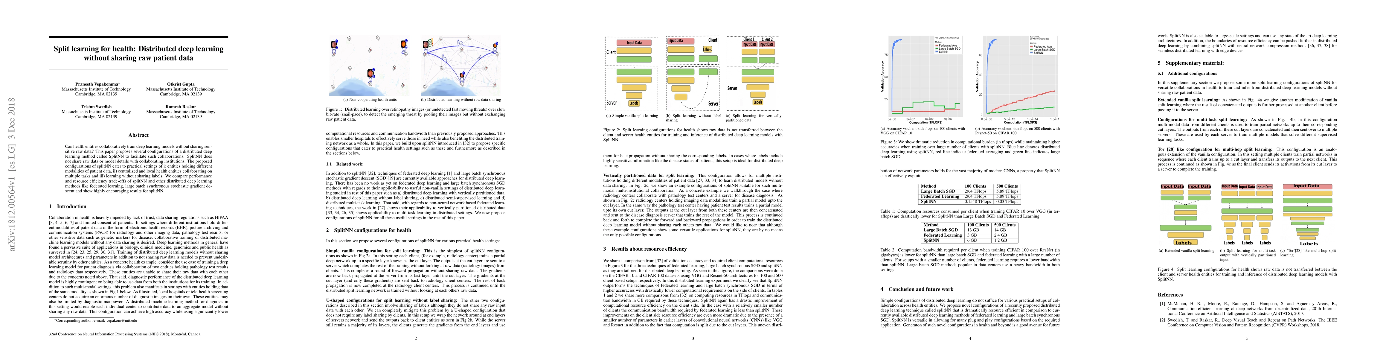 This paper introduces SplitNN, a distributed deep learning method enabling health entities to collaboratively train models without sharing sensitive raw patient data, addressing practical settings involving different data modalities and multi-task learning. Comparative analysis shows that SplitNN offers promising performance and resource efficiency over federated learning and other methods.