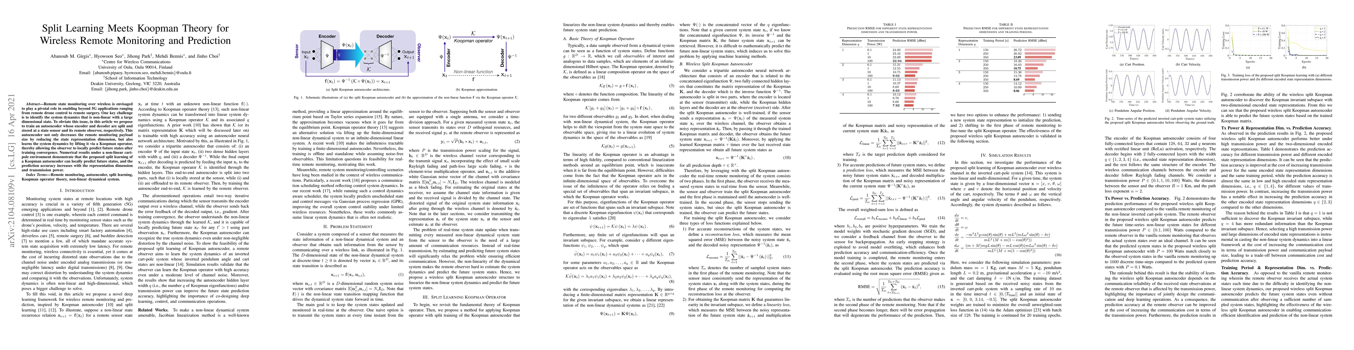 Remote state monitoring over wireless is envisaged to play a pivotal role in enabling beyond 5G applications ranging from remote drone control to remote surgery. One key challenge is to identify the system dynamics that is non-linear with a large dimensional state. To obviate this issue, in this article we propose to train an autoencoder whose encoder and decoder are split and stored at a state sensor and its remote observer, respectively. This autoencoder not only decreases the remote monitoring payload size by reducing the state representation dimension, but also learns the system dynamics by lifting it via a Koopman operator, thereby allowing the observer to locally predict future states after training convergence. Numerical results under a non-linear cart-pole environment demonstrate that the proposed split learning of a Koopman autoencoder can locally predict future states, and the prediction accuracy increases with the representation dimension and transmission power.