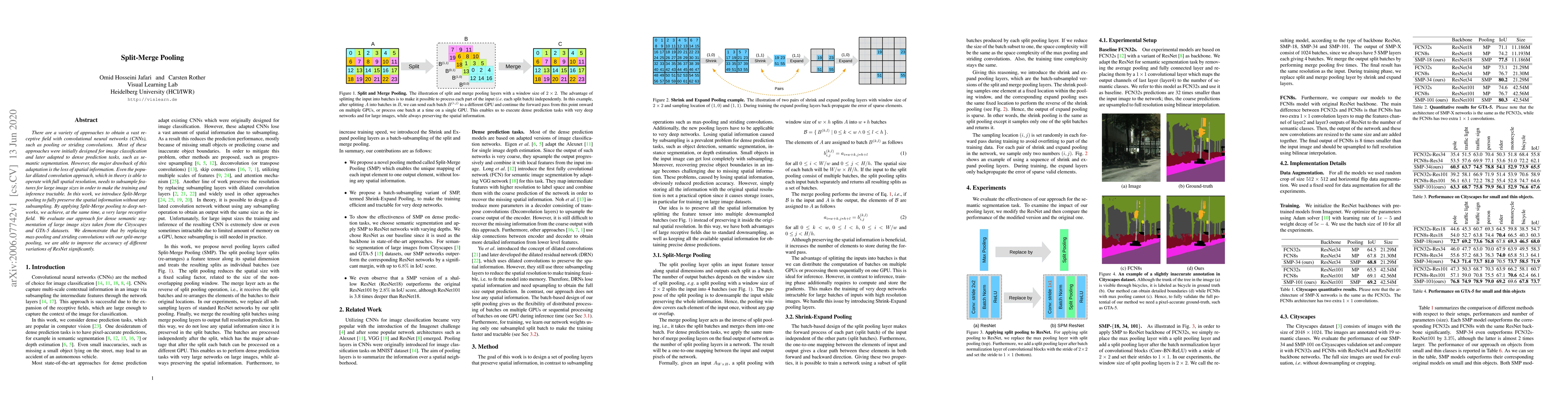 Split-Merge pooling preserves spatial information without subsampling, enabling large receptive fields in CNNs for dense prediction tasks. This approach improves semantic segmentation accuracy on large images from Cityscapes and GTA-5 datasets by replacing max-pooling and striding convolutions.