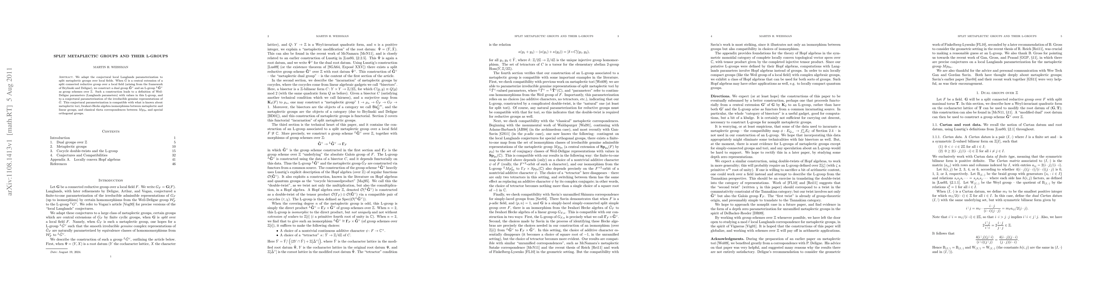This paper constructs dual and L-groups for split metaplectic groups over local fields, providing a conjectural local Langlands parameterization and defining Weil-Deligne parameters with values in these L-groups, thus proposing a new parameterization for irreducible genuine representations of metaplectic groups.