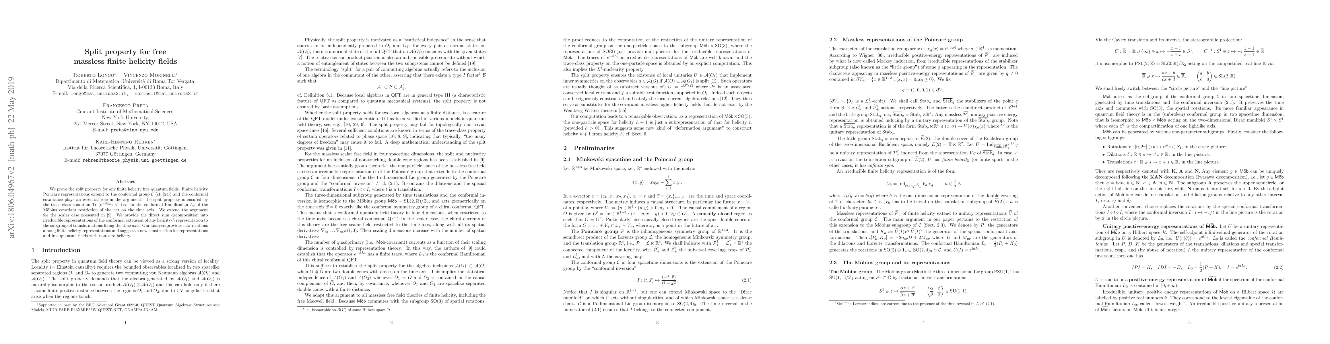This paper proves the split property for free massless finite helicity quantum fields, leveraging conformal covariance and the trace class condition. It extends the analysis to all helicities and provides a direct sum decomposition of conformal extensions of helicity representations.