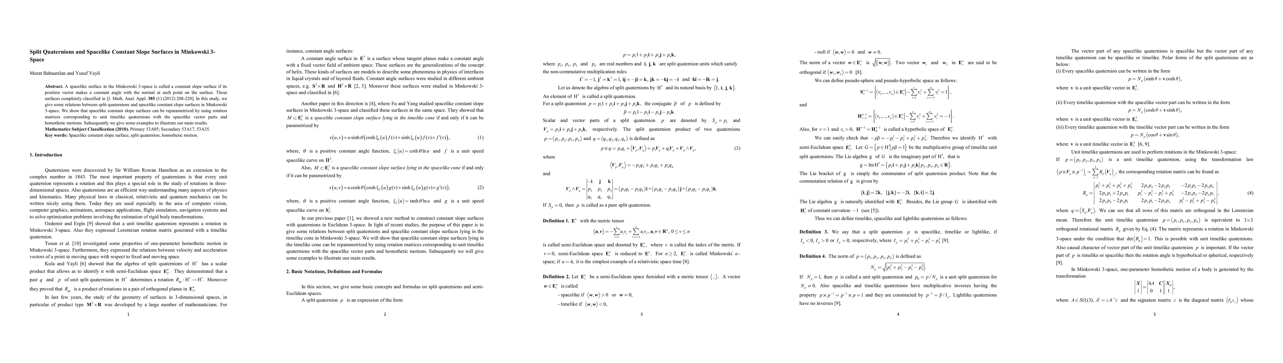 This paper explores the relationship between split quaternions and spacelike constant slope surfaces in Minkowski 3-space, demonstrating that these surfaces can be reparametrized using rotation matrices linked to unit timelike quaternions with spacelike components and homothetic motions. Examples are provided to illustrate the findings.