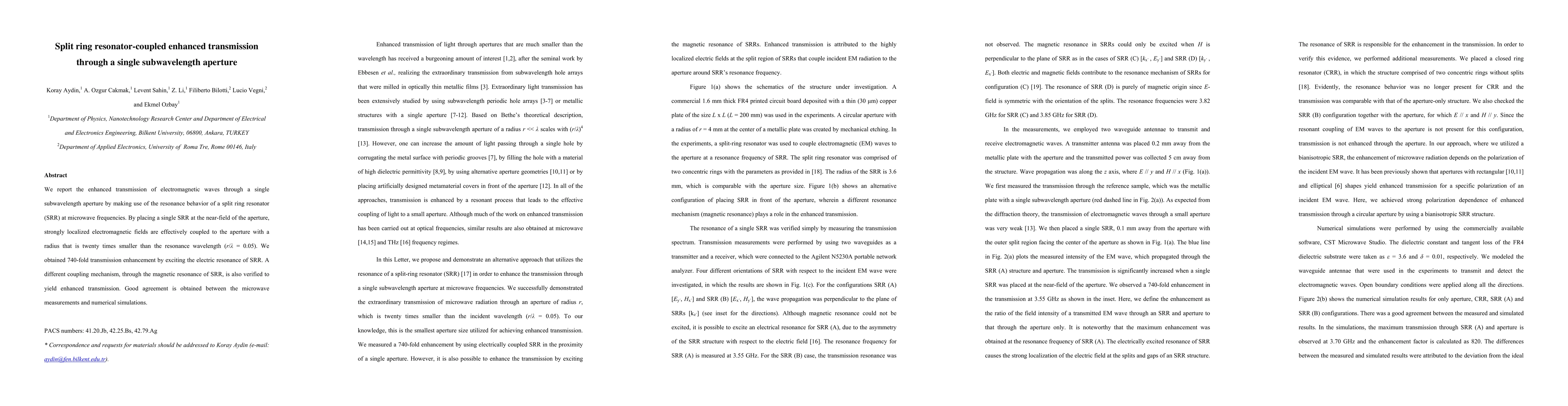 This paper reports a 740-fold enhancement in electromagnetic wave transmission through a single subwavelength aperture by coupling it with a split ring resonator (SRR) at microwave frequencies, demonstrating both electric and magnetic resonance mechanisms. Experimental results align well with numerical simulations.