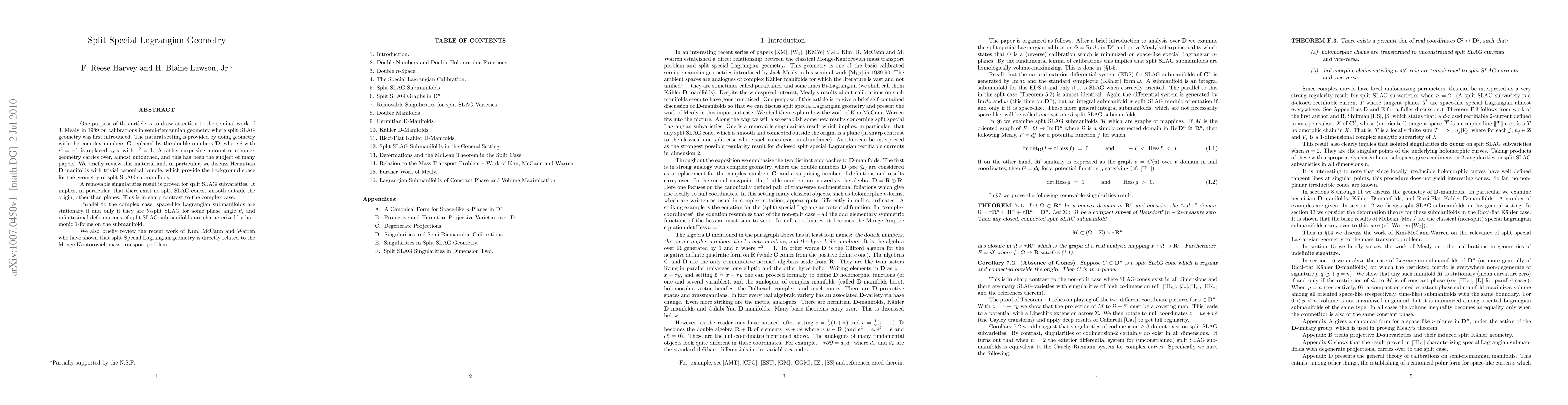 One purpose of this article is to draw attention to the seminal work of J. Mealy in 1989 on calibrations in semi-riemannian geometry where split SLAG geometry was first introduced. The natural setting is provided by doing geometry with the complex numbers C replaced by the double numbers D, where i with i^2 = -1 is replaced by tau with tau^2 = 1. A rather surprising amount of complex geometry carries over, almost untouched, and this has been the subject of many papers. We briefly review this material and, in particular, we discuss Hermitian D-manifolds with trivial canonical bundle, which provide the background space for the geometry of split SLAG submanifolds. A removable singularities result is proved for split SLAG subvarieties. It implies, in particular, that there exist no split SLAG cones, smooth outside the origin, other than planes. This is in sharp contrast to the complex case. Parallel to the complex case, space-like Lagrangian submanifolds are stationary if and only if they are theta-split SLAG for some phase angle theta, and infinitesimal deformations of split SLAG submanifolds are characterized by harmonic 1-forms on the submanifold. We also briefly review the recent work of Kim, McCann and Warren who have shown that split Special Lagrangian geometry is directly related to the Monge-Kantorovich mass transport problem.