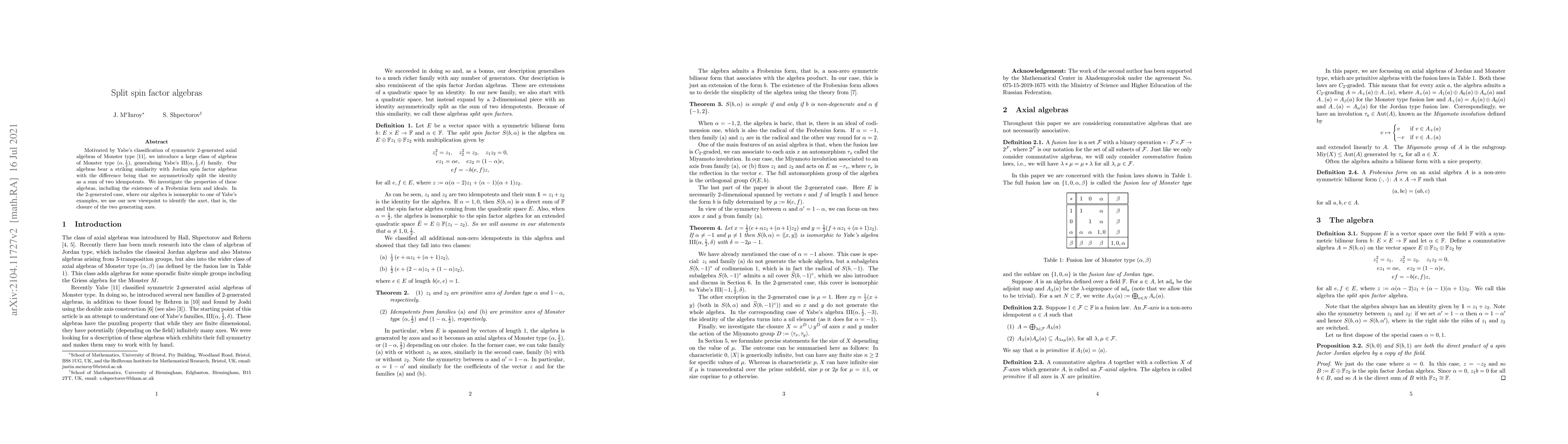Motivated by Yabe's classification of symmetric $2$-generated axial algebras of Monster type, we introduce a large class of algebras of Monster type $(\alpha, \frac{1}{2})$, generalising Yabe's $\mathrm{III}(\alpha,\frac{1}{2}, \delta)$ family. Our algebras bear a striking similarity with Jordan spin factor algebras with the difference being that we asymmetrically split the identity as a sum of two idempotents. We investigate the properties of this algebra, including the existence of a Frobenius form and ideals. In the $2$-generated case, where our algebra is isomorphic to one of Yabe's examples, we use our new viewpoint to identify the axet, that is, the closure of the two generating axes.