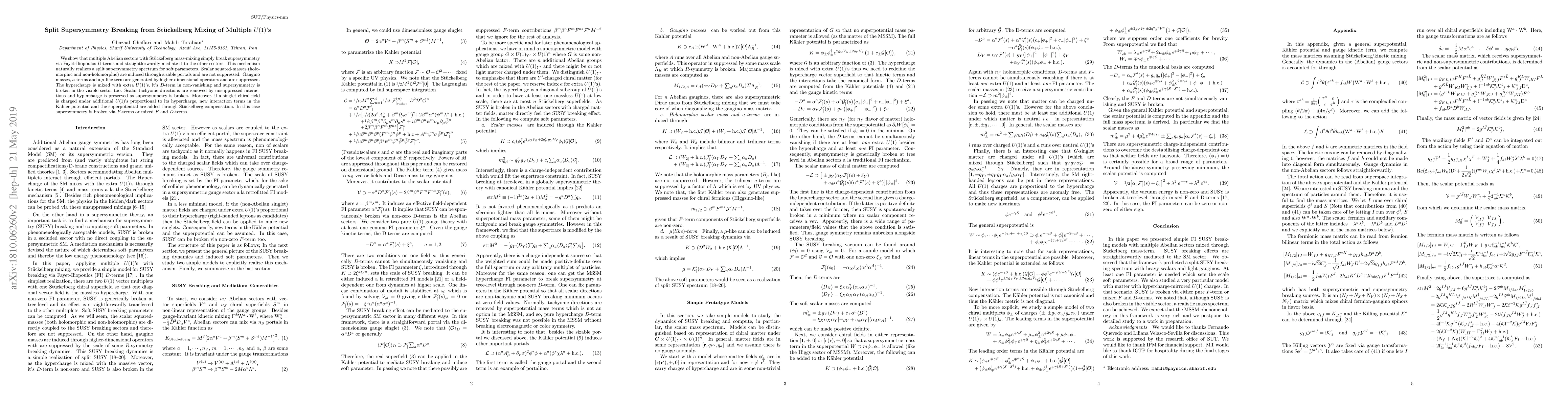 We show that multiple Abelian sectors with Stuckelberg mass-mixing simply break supersymmetry via Fayet-Iliopoulos D-terms and straightforwardly mediate it to the other sectors. This mechanism naturally realizes a split supersymmetry spectrum for soft parameters. Scalar squared-masses (holomorphic and non-holomorphic) are induced through sizable portals and are not suppressed. Gaugino masses, a-terms and a mu-like term are generated by higher-dimensional operators and are suppressed. The hypercharge is mixed with extra U(1)'s, it's D-term in non-vanishing and supersymmetry is broken in the visible sector too. Scalar tachyonic directions are removed by unsuppressed interactions and hypercharge is preserved as supersymmetry is broken. Moreover, if a singlet chiral field is charged under additional $U(1)$'s proportional to its hypercharge, new interaction terms in the Kahler potential and the superpotential are added through Stuckelberg compensation. In this case supersymmetry is broken via F-terms or mixed F and D-terms.