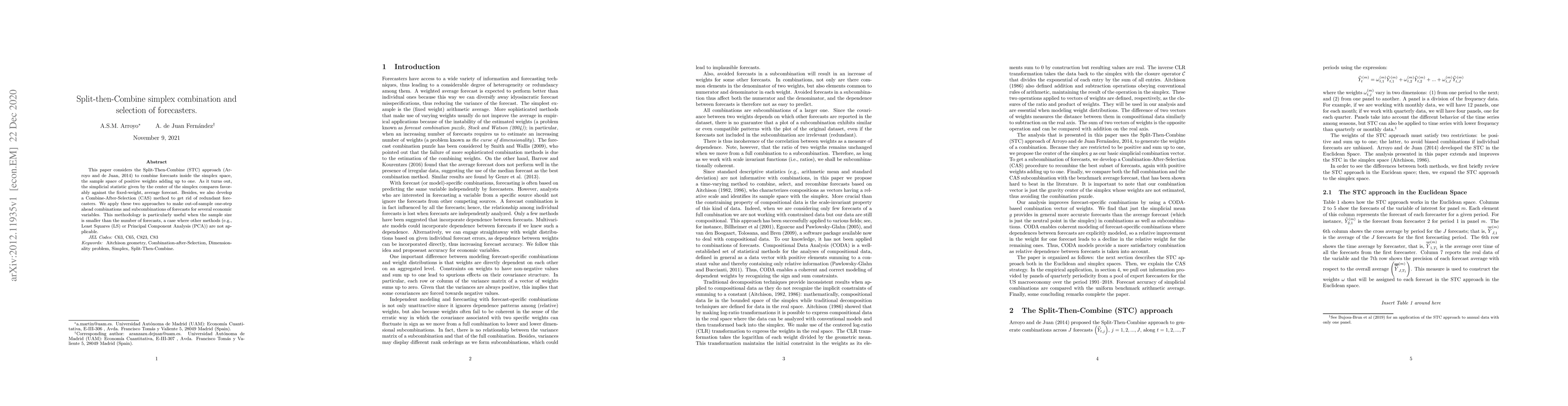 This paper considers the Split-Then-Combine (STC) approach (Arroyo and de Juan, 2014) to combine forecasts inside the simplex space, the sample space of positive weights adding up to one. As it turns out, the simplicial statistic given by the center of the simplex compares favorably against the fixed-weight, average forecast. Besides, we also develop a Combine-After-Selection (CAS) method to get rid of redundant forecasters. We apply these two approaches to make out-of-sample one-step ahead combinations and subcombinations of forecasts for several economic variables. This methodology is particularly useful when the sample size is smaller than the number of forecasts, a case where other methods (e.g., Least Squares (LS) or Principal Component Analysis (PCA)) are not applicable.