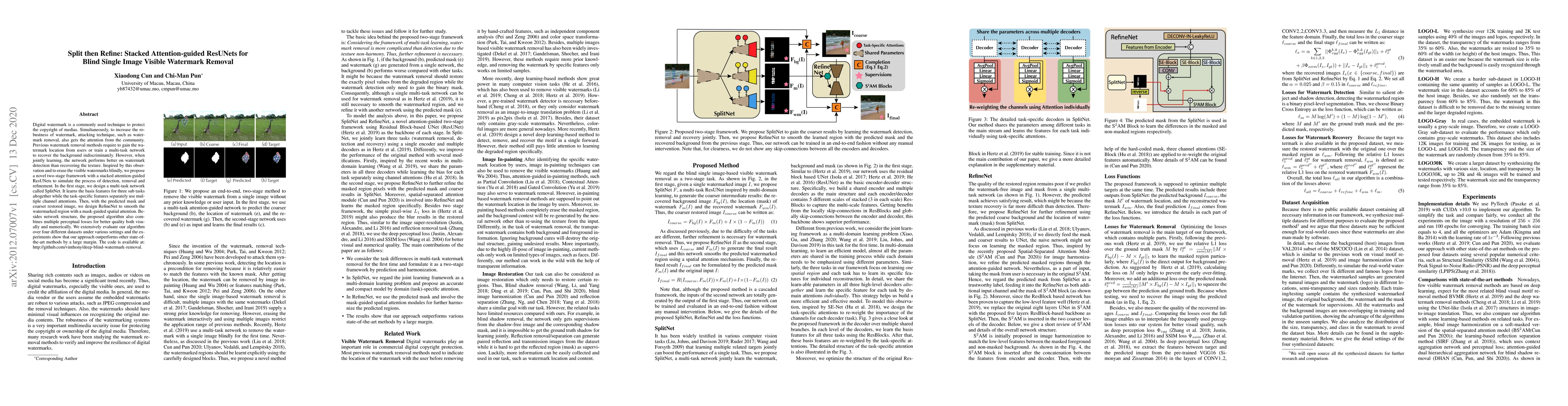 This paper proposes a two-stage framework using stacked attention-guided ResUNets for blind single image visible watermark removal, featuring SplitNet for feature extraction and RefineNet for mask-guided refinement, achieving superior performance over existing methods. The approach combines multiple perceptual losses for enhanced visual and numerical quality.