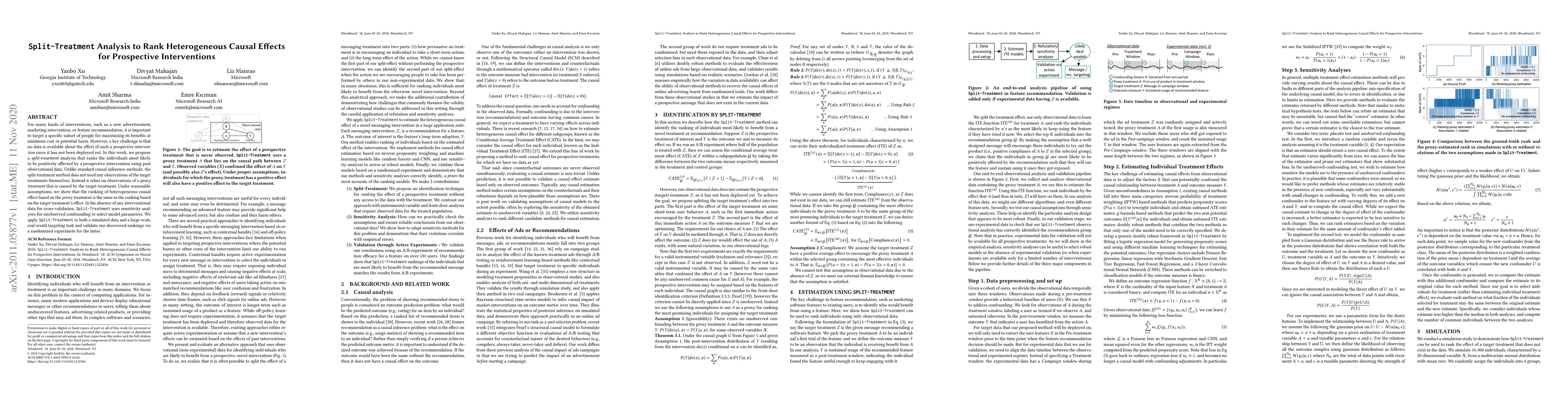 For many kinds of interventions, such as a new advertisement, marketing intervention, or feature recommendation, it is important to target a specific subset of people for maximizing its benefits at minimum cost or potential harm. However, a key challenge is that no data is available about the effect of such a prospective intervention since it has not been deployed yet. In this work, we propose a split-treatment analysis that ranks the individuals most likely to be positively affected by a prospective intervention using past observational data. Unlike standard causal inference methods, the split-treatment method does not need any observations of the target treatments themselves. Instead it relies on observations of a proxy treatment that is caused by the target treatment. Under reasonable assumptions, we show that the ranking of heterogeneous causal effect based on the proxy treatment is the same as the ranking based on the target treatment's effect. In the absence of any interventional data for cross-validation, Split-Treatment uses sensitivity analyses for unobserved confounding to select model parameters. We apply Split-Treatment to both a simulated data and a large-scale, real-world targeting task and validate our discovered rankings via a randomized experiment for the latter.