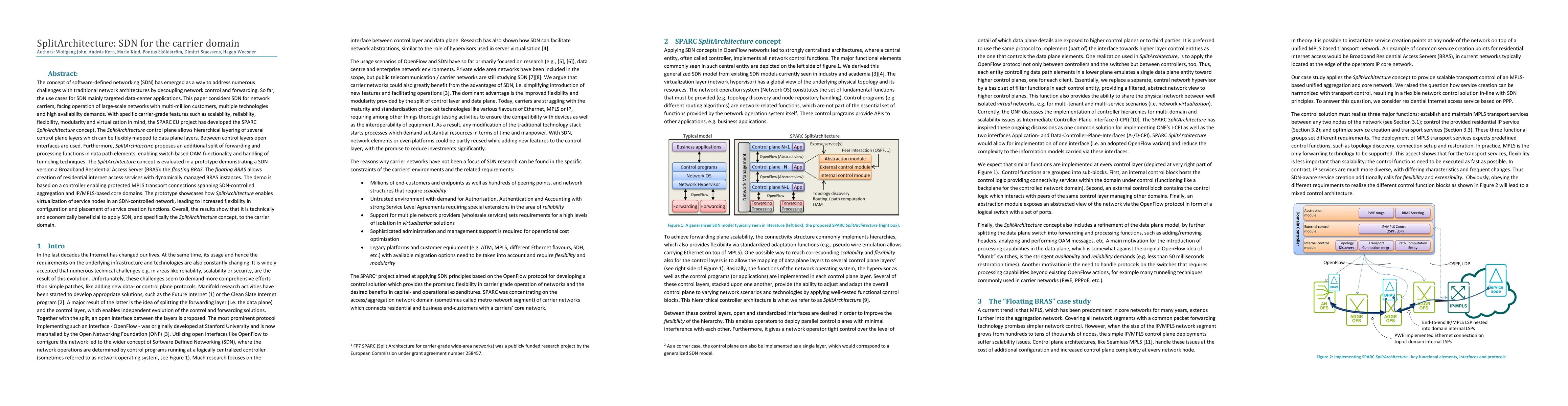 The SPARC SplitArchitecture concept leverages SDN to address challenges in carrier networks, emphasizing scalability and flexibility. The prototype demonstrates an SDN-based BRAS, showcasing increased flexibility in service node virtualization and management, proving the technical and economic benefits of SDN in the carrier domain.