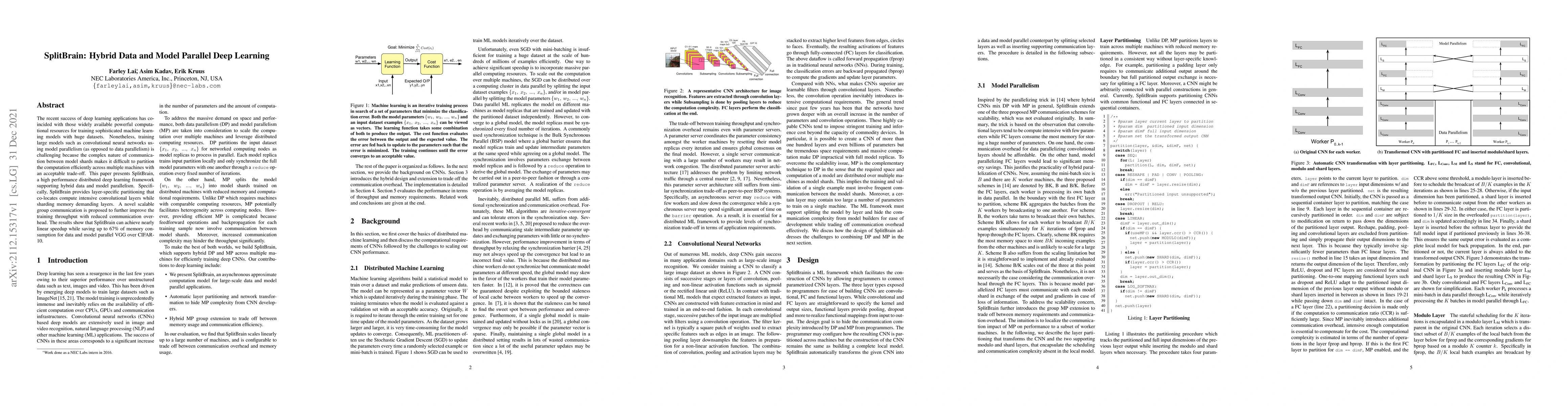 SplitBrain is a distributed deep learning framework that supports hybrid data and model parallelism, optimizing performance by partitioning convolutional layers for compute-intensive tasks and memory-intensive layers for data-driven tasks. It employs scalable group communication to reduce overhead, achieving nearly linear speedup and up to 67% memory savings in training VGG models on CIFAR-10.