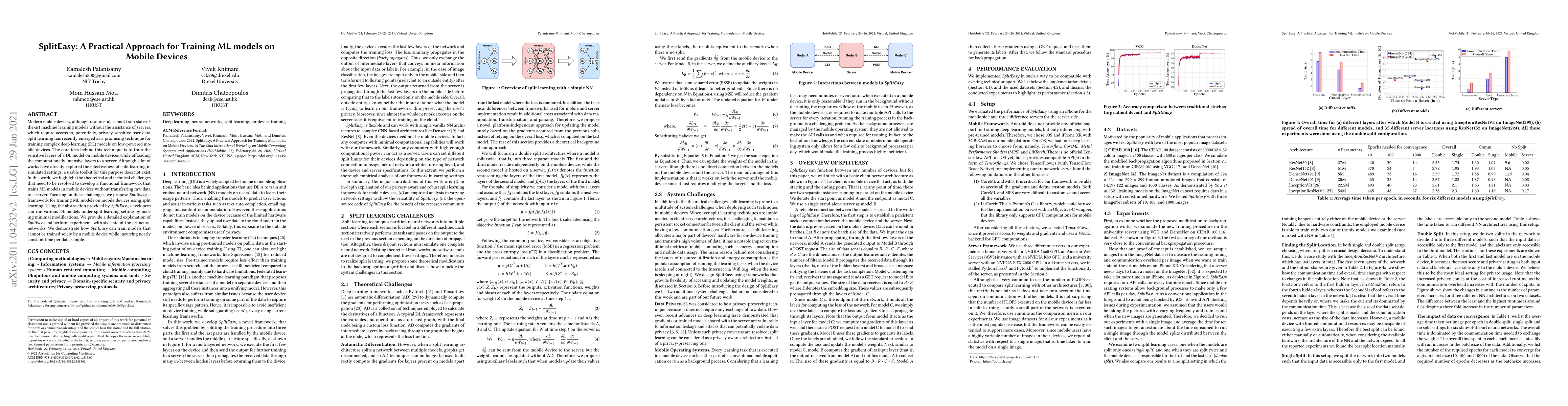 SplitEasy is a proposed framework for training machine learning models on mobile devices using split learning, aiming to keep sensitive data local by offloading computationally intensive tasks to a server. The framework addresses theoretical and technical challenges to enable efficient training without transferring raw data, demonstrating its effectiveness with six state-of-the-art neural networks.