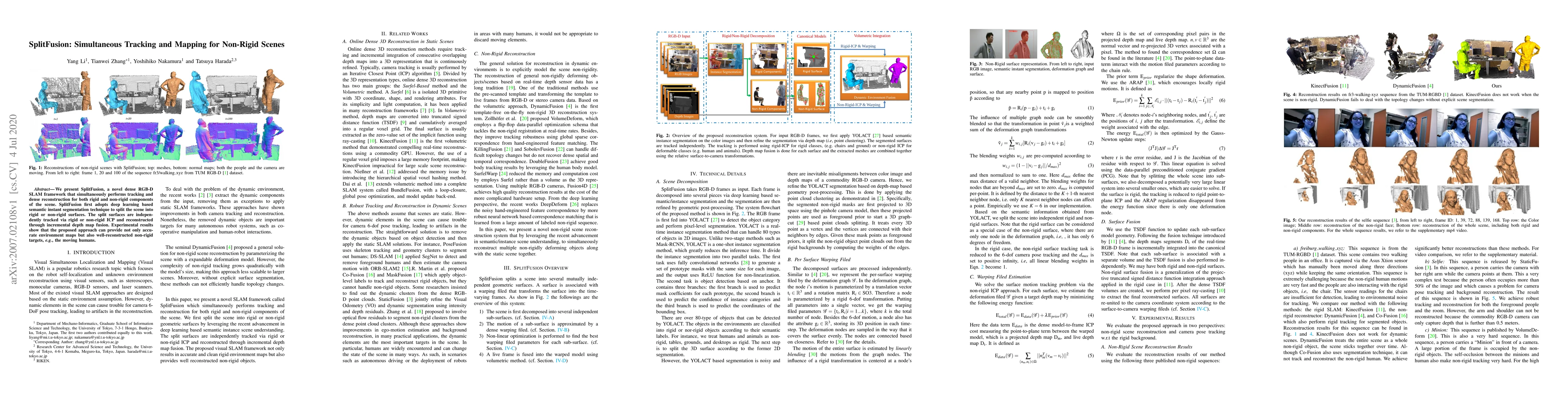 SplitFusion is a dense RGB-D SLAM framework that simultaneously tracks and reconstructs both rigid and non-rigid scene components using deep learning for semantic segmentation. It independently processes rigid and non-rigid surfaces with respective ICP methods, achieving accurate environment maps and well-reconstructed non-rigid targets.