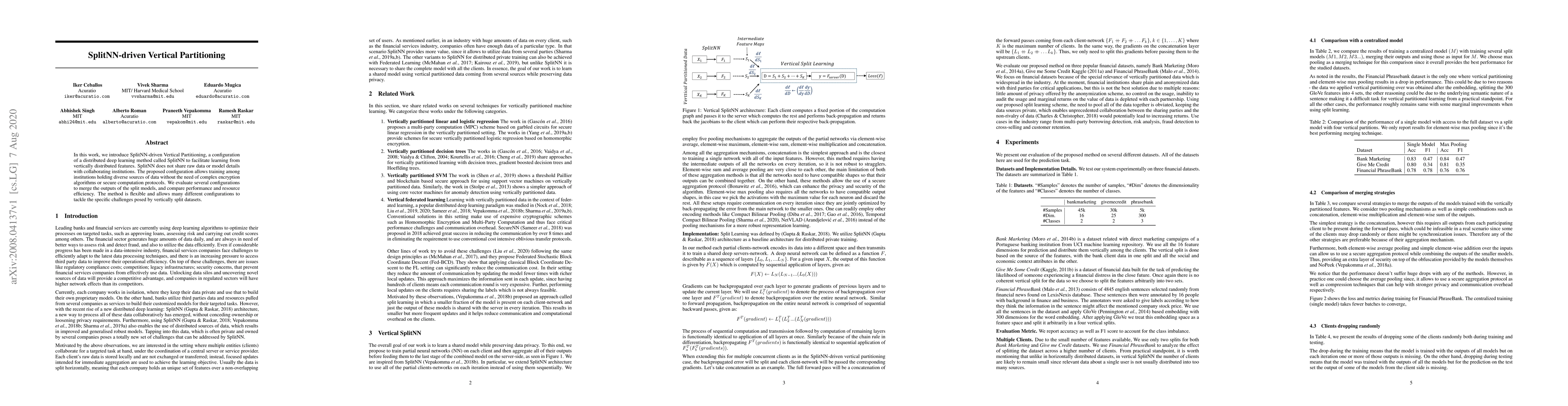 The research introduces SplitNN-driven Vertical Partitioning, a configuration of SplitNN for distributed deep learning from vertically distributed features without sharing raw data or model details.