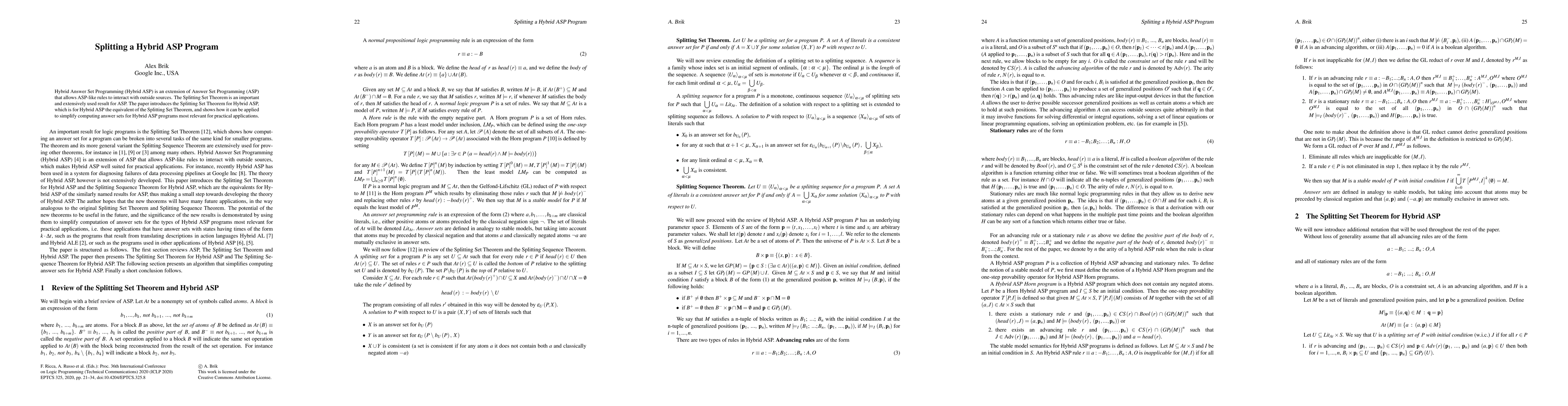 The paper introduces the Splitting Set Theorem for Hybrid Answer Set Programming (Hybrid ASP), providing a practical tool to simplify the computation of answer sets, analogous to its use in traditional ASP. This theorem is shown to be applicable to hybrid programs that interact with external sources.