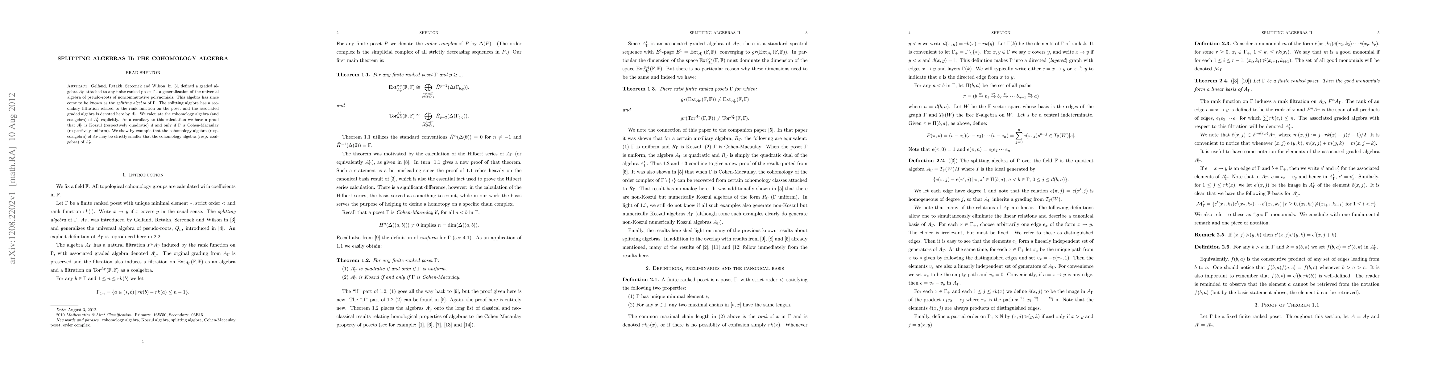 Gelfand, Retakh, Serconek and Wilson, in \cite{GRSW}, defined a graded algebra $A_\Gamma$ attached to any finite ranked poset $\Gamma$ - a generalization of the universal algebra of pseudo-roots of noncommutative polynomials. This algebra has since come to be known as the splitting algebra of $\Gamma$. The splitting algebra has a secondary filtration related to the rank function on the poset and the associated graded algebra is denoted here by $A'_\Gamma$. We calculate the cohomology algebra (and coalgebra) of $A'_\Gamma$ explicitly. As a corollary to this calculation we have a proof that $A'_\Gamma$ is Koszul (respectively quadratic) if and only if $\Gamma$ is Cohen-Macaulay (respectively uniform). We show by example that the cohomology algebra (resp. coalgebra) of $A_\Gamma$ may be strictly smaller that the cohomology algebra (resp. coalgebra) of $A'_\Gamma$.