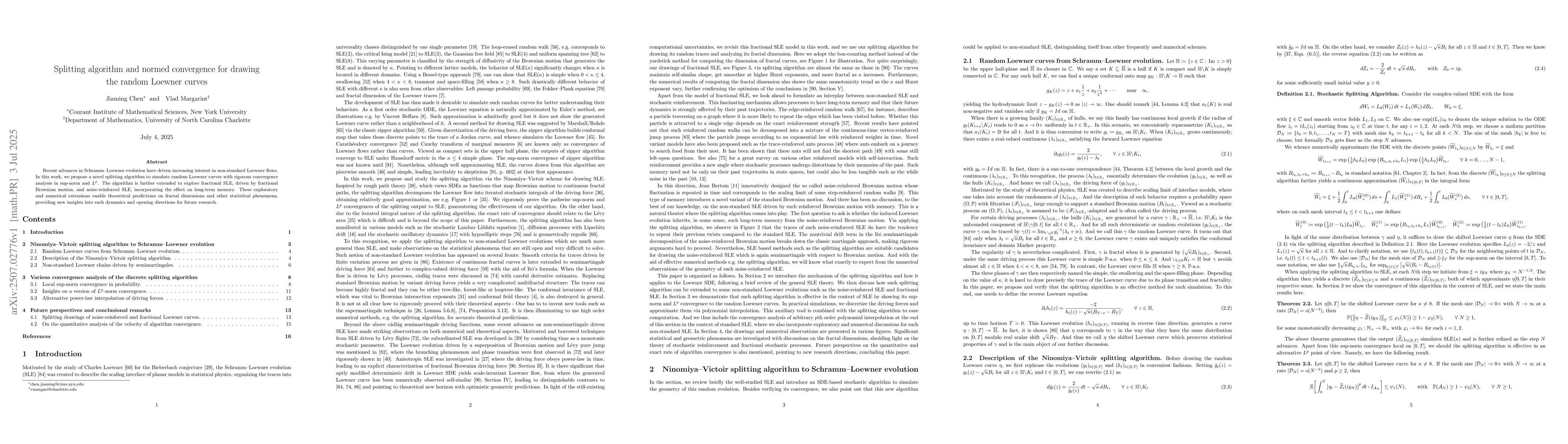 Recent advances in Schramm-Loewner evolution have driven increasing interest in non-standard Loewner flows. In this work, we propose a novel splitting algorithm to simulate random Loewner curves with rigorous convergence analysis in sup-norm and $L^p$. The algorithm is further extended to explore fractional SLE, driven by fractional Brownian motion, and noise-reinforced SLE, incorporating the effect on long-term memory. These exploratory and numerical extensions enable theoretical predictions on fractal dimensions and other statistical phenomena, providing new insights into such dynamics and opening directions for future research.