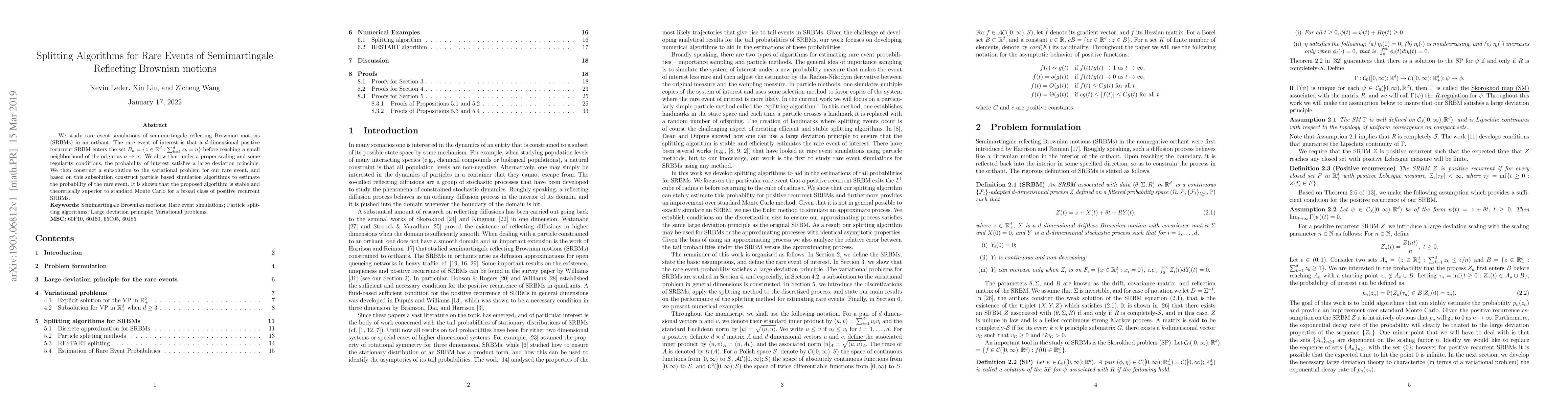 This paper explores rare event simulations for semimartingale reflecting Brownian motions (SRBMs) in an orthant, focusing on the probability of SRBMs entering a specific set before reaching a small neighborhood of the origin. It demonstrates a large deviation principle under proper scaling and regularity conditions, and proposes particle-based simulation algorithms that outperform standard Monte Carlo methods.
