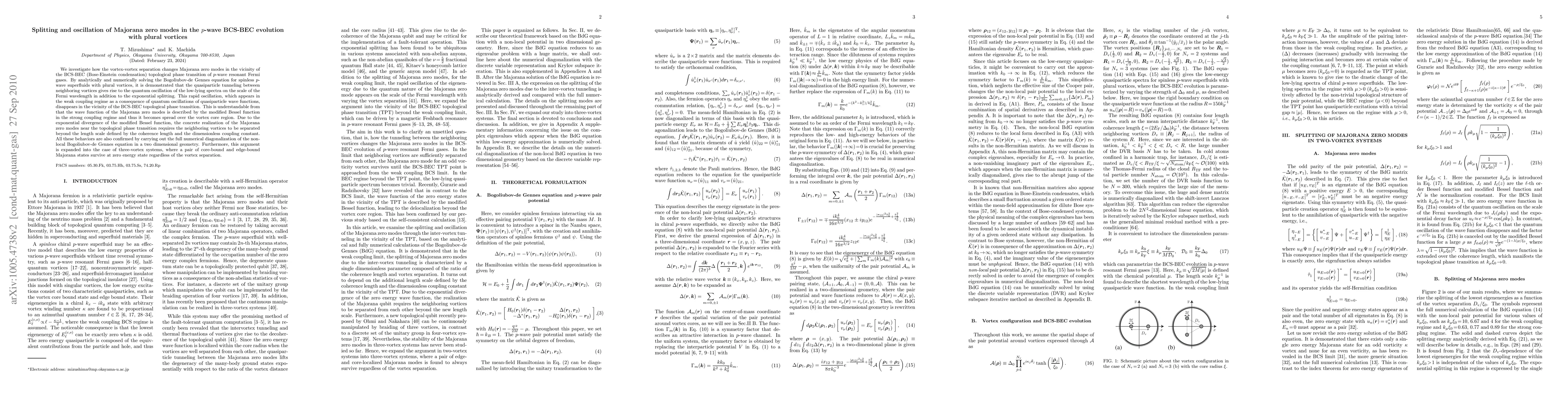 This paper investigates the impact of vortex separation on Majorana zero modes in p-wave BCS-BEC topological phase transitions, showing that quasiparticle tunneling causes quantum oscillations in low-lying spectra. These oscillations vanish near the transition due to the spread of Majorana zero mode wave functions, requiring significant vortex separation for their realization.