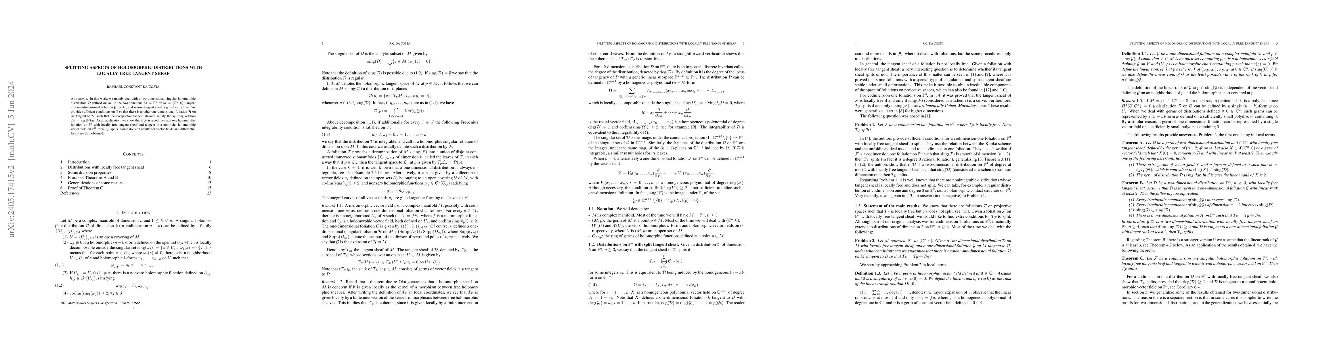 This paper investigates conditions under which a singular holomorphic distribution in two dimensions, tangent to a one-dimensional foliation and with a locally free tangent sheaf, can be split into a direct sum of the tangent sheaves of two foliations. An application demonstrates that a codimension one foliation on $\mathbb{P}^3$ tangent to a nontrivial vector field also has a locally free tangent sheaf that splits.