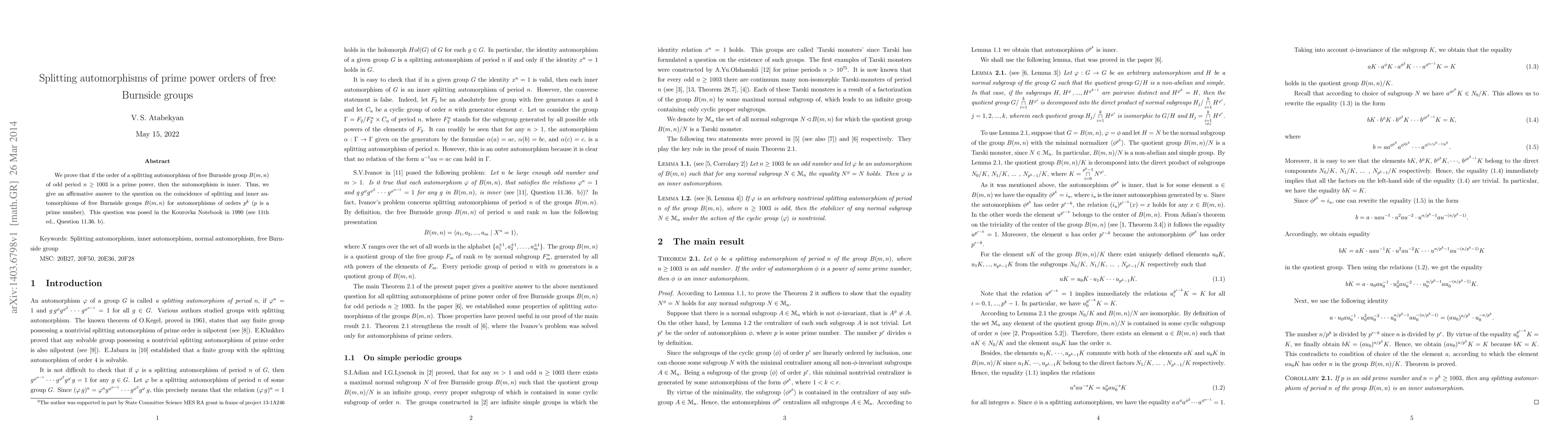 This paper proves that any splitting automorphism of a free Burnside group $B(m,n)$ with odd period $n \ge 1003$ and prime power order is inner. This resolves a longstanding question from the Kourovka Notebook regarding the equivalence of splitting and inner automorphisms in such groups.
